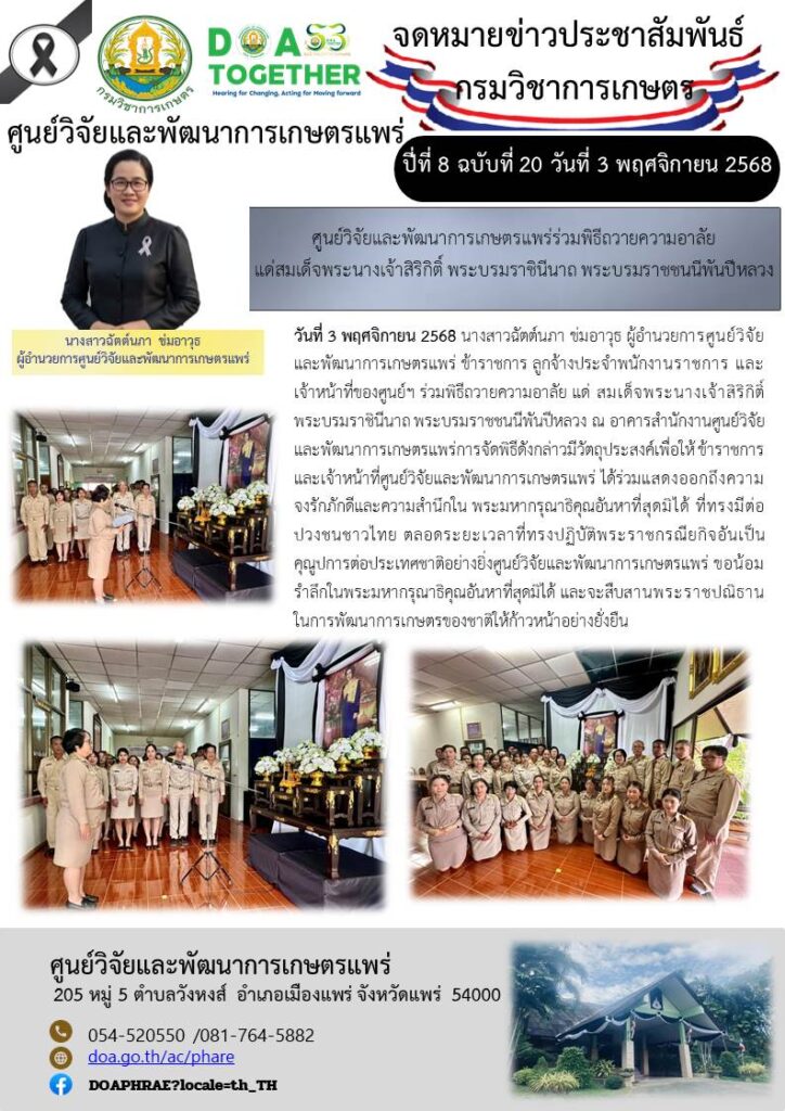 ศูนย์วิจัยและพัฒนาการเกษตรแพร่ร่วมพิธีถวายความอาลัย แด่สมเด็จพระนางเจ้าสิริกิติ์ พระบรมราชินีนาถ พระบรมราชชนนีพันปีหลวง 3 พฤศจิกายน 2025 pharedoa ข่าวกิจกรรม จำนวนคนดู 3 FacebookFacebookXXLINELine