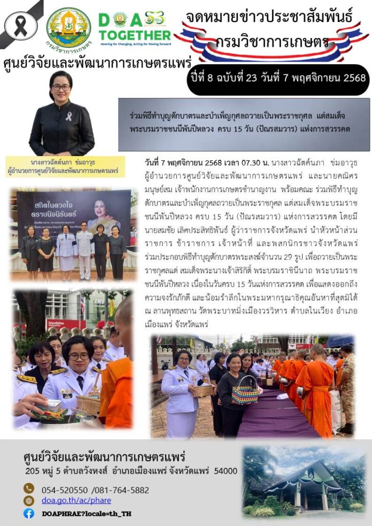 ร่วมพิธีทำบุญตักบาตรและบำเพ็ญกุศลถวายเป็นพระราชกุศล แด่สมเด็จ พระบรมราชชนนีพันปีหลวง ครบ 15 วัน (ปัณรสมวาร) แห่งการสวรรคต 7 พฤศจิกายน 2025 pharedoa ข่าวกิจกรรม จำนวนคนดู 2 FacebookFacebookXXLINELine