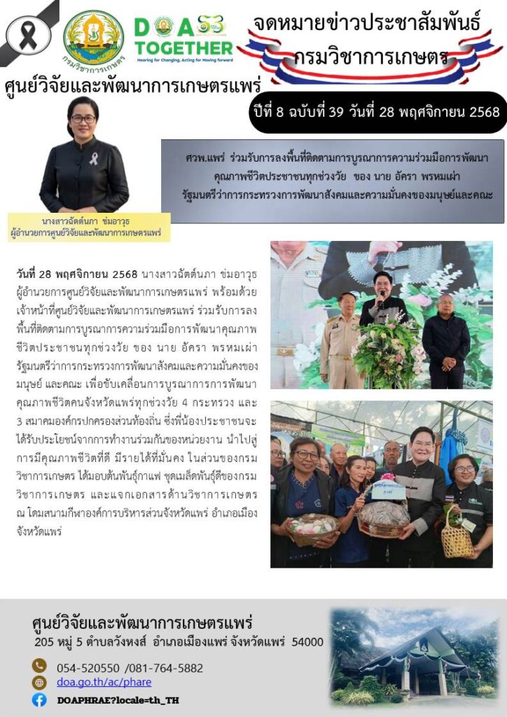 ศวพ.แพร่ ร่วมรับการลงพื้นที่ติดตามการบูรณาการความร่วมมือการพัฒนาคุณภาพชีวิตประชาชนทุกช่วงวัย ของ นาย อัครา พรหมเผ่า รัฐมนตรีว่าการกระทรวงการพัฒนาสังคมและความมั่นคงของมนุษย์และคณะ 28 พฤศจิกายน 2025 pharedoa ข่าวกิจกรรม จำนวนคนดู 0 FacebookFacebookXXLINELine
