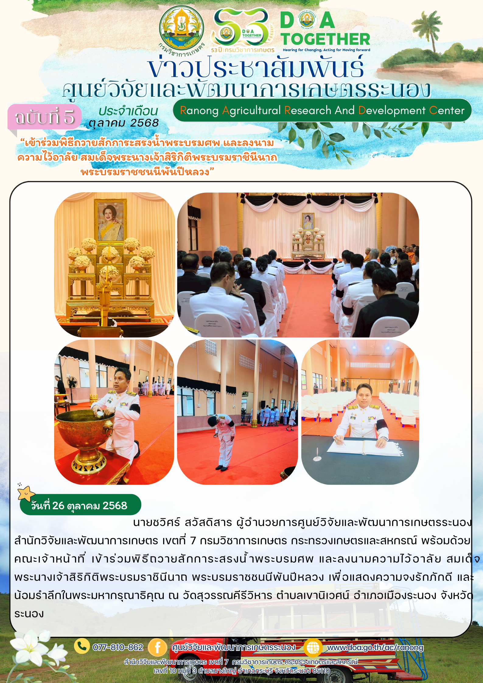 วันที่ 26 ตุลาคม 2568 นายชวิศร์ สวัสดิสาร ผู้อำนวยการศูนย์วิจัยและพัฒนาการเกษตรระนอง สำนักวิจัยและพัฒนาการเกษตร เขตที่ 7 กรมวิชาการเกษตร กระทรวงเกษตรและสหกรณ์ พร้อมด้วยคณะเจ้าหน้าที่ เข้าร่วมพิธีถวายสักการะสรงน้ำพระบรมศพ และลงนามความไว้อาลัย สมเด็จพระนางเจ้าสิริกิติพระบรมราชินีนาถ พระบรมราชชนนีพันปีหลวง เพื่อแสดงความจงรักภักดี และน้อมรำลึกในพระมหากรุณาธิคุณ ณ วัดสุวรรณคีรีวิหาร ตำบลเขานิเวศน์ อำเภอเมืองระนอง จังหวัดระนอง