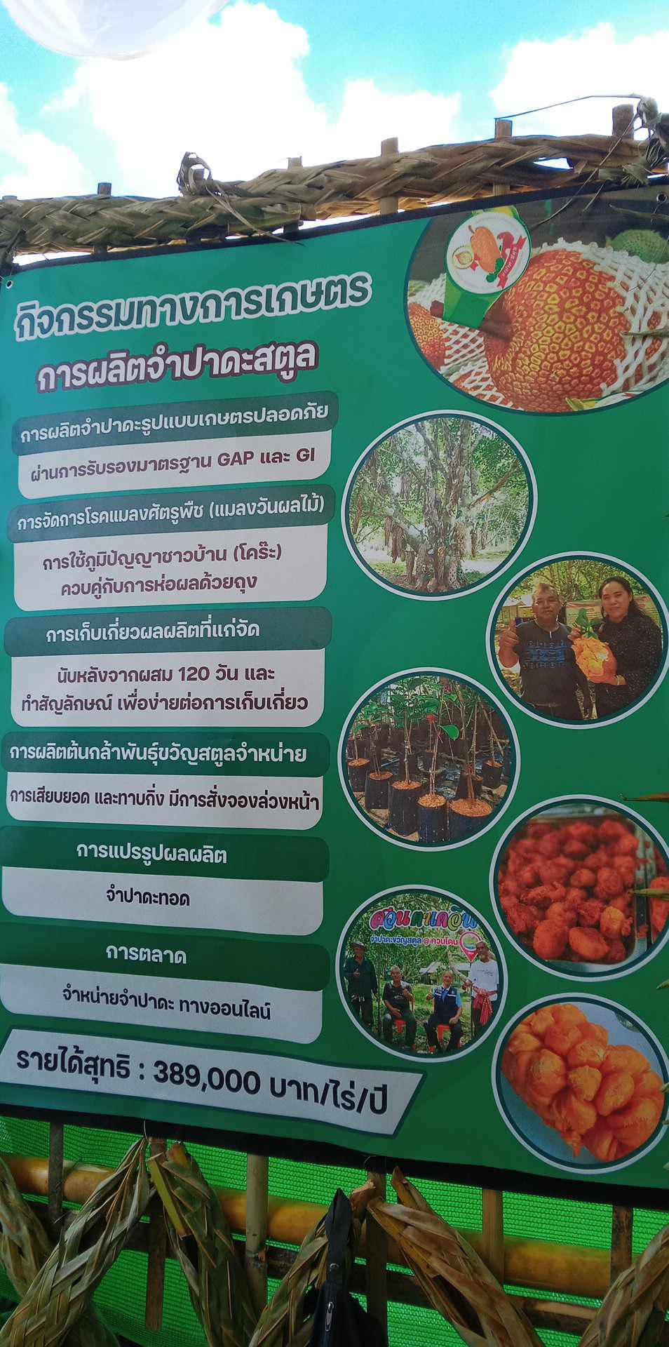 ศูนย์วิจัยและพัฒนาการเกษตรสตูล เข้าร่วมจัดนิทรรศการเรื่อง จำปาดะ ไม้ผลอัตลักษณ์ GI จังหวัดสตูล ประกอบด้วย เรื่องพันธุ์จำปาดะสตูล การปลูกและการแปรรูปจำปาดะ และนำเกษตรกรต้นแบบดีเด่นของจังหวัดสตูล นายรอเสด ตาเดอิน จากสวนตาเดอิน ที่ตั้งแปลง ม.4 ตำบลควนโดน อำเภอควนโดน จังหวัดสตูล เข้าร่วมงานและเข้ารับใบประกาศนียบัตร “เกษตรกรต้นแบบดีเด่นในระดับจังหวัด” จาก ดร.ภัสชญภณ หมื่นแจ้ง รองอธิบดีกรมวิชาการเกษตร ซึ่งนายรอเสด ตาเดอิน มีคติประจำใจ คือ “ทำอะไร ต้องทำให้จริง ถ้าทำจริง ความสำเร็จต้องตามมา” โดยปัจจัยความสำเร็จ คือ มีความแน่วแน่ มุ่งมั่น ในแนวทางของตนเอง ไม่สนใจและไม่เสียกำลังใจในคำวิจารณ์ในทางลบ ทำจนได้เกิด “สวนตาเดอิน” สวนจำปาดะขวัญสตูล ไม่ทำเกษตรตามกระแส ให้คุณค่าพืชท้องถิ่นทำให้สร้างมูลค่า พร้อมๆกับการรักษาสมดุลชีวิตแบบอิสลาม ดูแลครอบครัวผ่านกิจกรรมการเกษตรและกิจกรรมทางศาสนาควบคู่กัน สินค้าที่สร้างรายได้สูง ได้แก่ จำปาดะผลสด จำปาดะทอดและต้นพันธุ์จำปาดะ