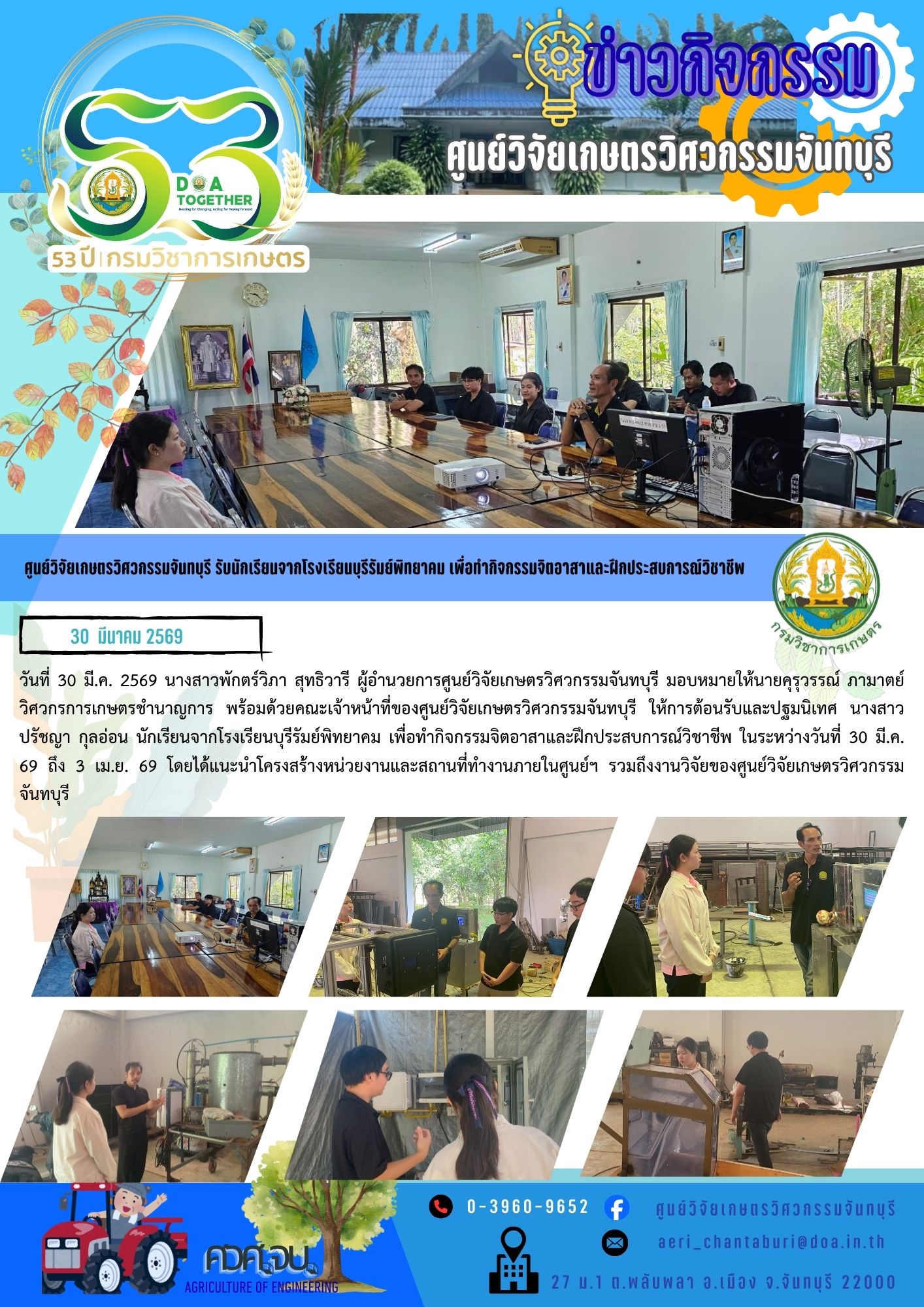 วันที่ 30 มี.ค. 2569 นางสาวพักตร์วิภา สุทธิวารี ผู้อำนวยการศูนย์วิจัยเกษตรวิศวกรรมจันทบุรี มอบหมายให้นายคุรุวรรณ์ ภามาตย์ วิศวกรการเกษตรชำนาญการ พร้อมด้วยคณะเจ้าหน้าที่ของศูนย์วิจัยเกษตรวิศวกรรมจันทบุรี ให้การต้อนรับและปฐมนิเทศ นางสาว ปรัชญา กุลอ่อน นักเรียนจากโรงเรียนบุรีรัมย์พิทยาคม เพื่อทำกิจกรรมจิตอาสาและฝึกประสบการณ์วิชาชีพ ในระหว่างวันที่ 30 มี.ค. 69 ถึง 3 เม.ย. 69 โดยได้แนะนำโครงสร้างหน่วยงานและสถานที่ทำงานภายในศูนย์ฯ รวมถึงงานวิจัยของศูนย์วิจัยเกษตรวิศวกรรมจันทบุรี