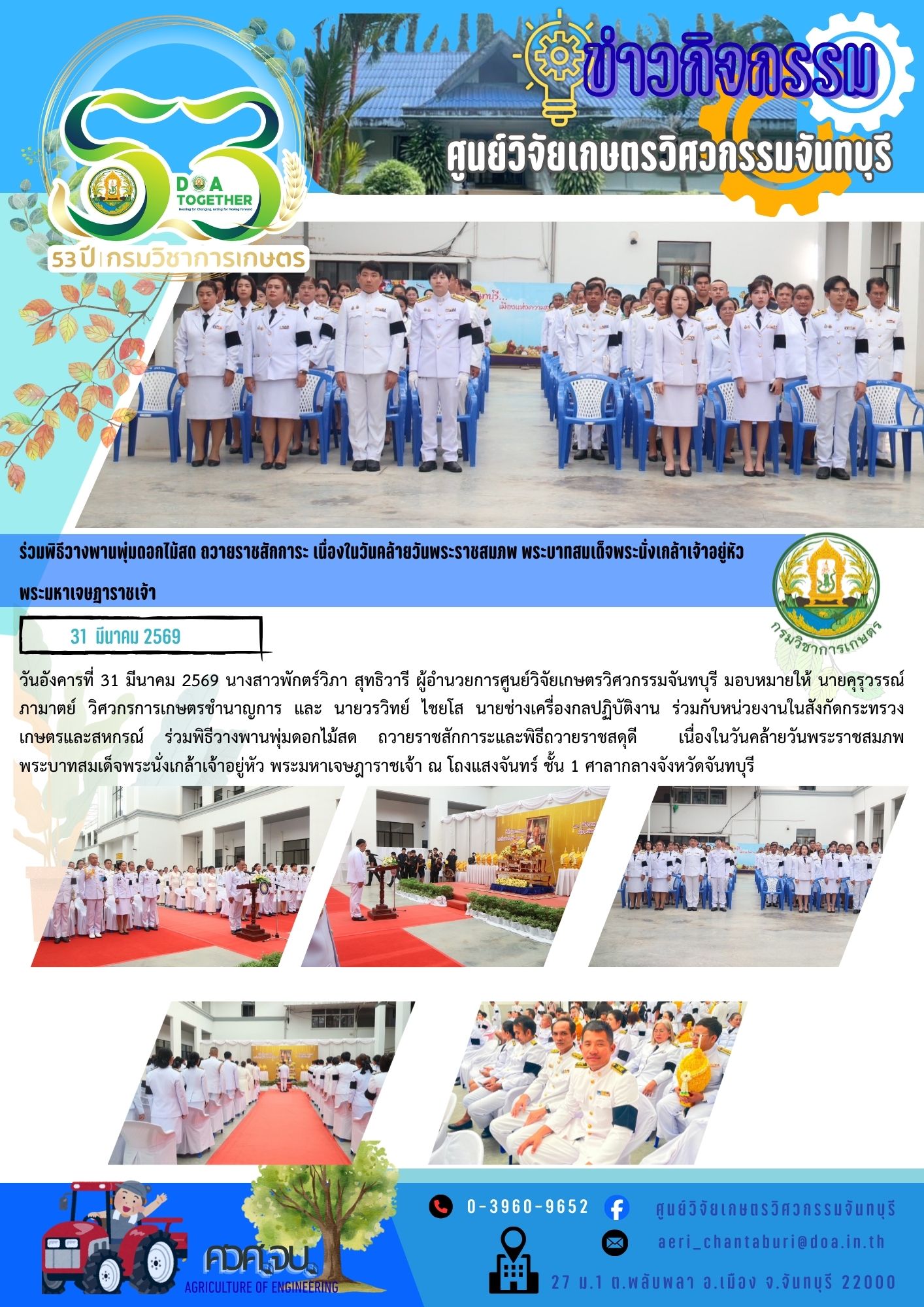 วันอังคารที่ 31 มีนาคม 2569 นางสาวพักตร์วิภา สุทธิวารี ผู้อำนวยการศูนย์วิจัยเกษตรวิศวกรรมจันทบุรี มอบหมายให้ นายคุรุวรรณ์ ภามาตย์ วิศวกรการเกษตรชำนาญการ และ นายวรวิทย์ ไชยโส นายช่างเครื่องกลปฏิบัติงาน ร่วมกับหน่วยงานในสังกัดกระทรวงเกษตรและสหกรณ์ ร่วมพิธีวางพานพุ่มดอกไม้สด ถวายราชสักการะและพิธีถวายราชสดุดี เนื่องในวันคล้ายวันพระราชสมภพ พระบาทสมเด็จพระนั่งเกล้าเจ้าอยู่หัว พระมหาเจษฎาราชเจ้า ณ โถงแสงจันทร์ ชั้น 1 ศาลากลางจังหวัดจันทบุรี