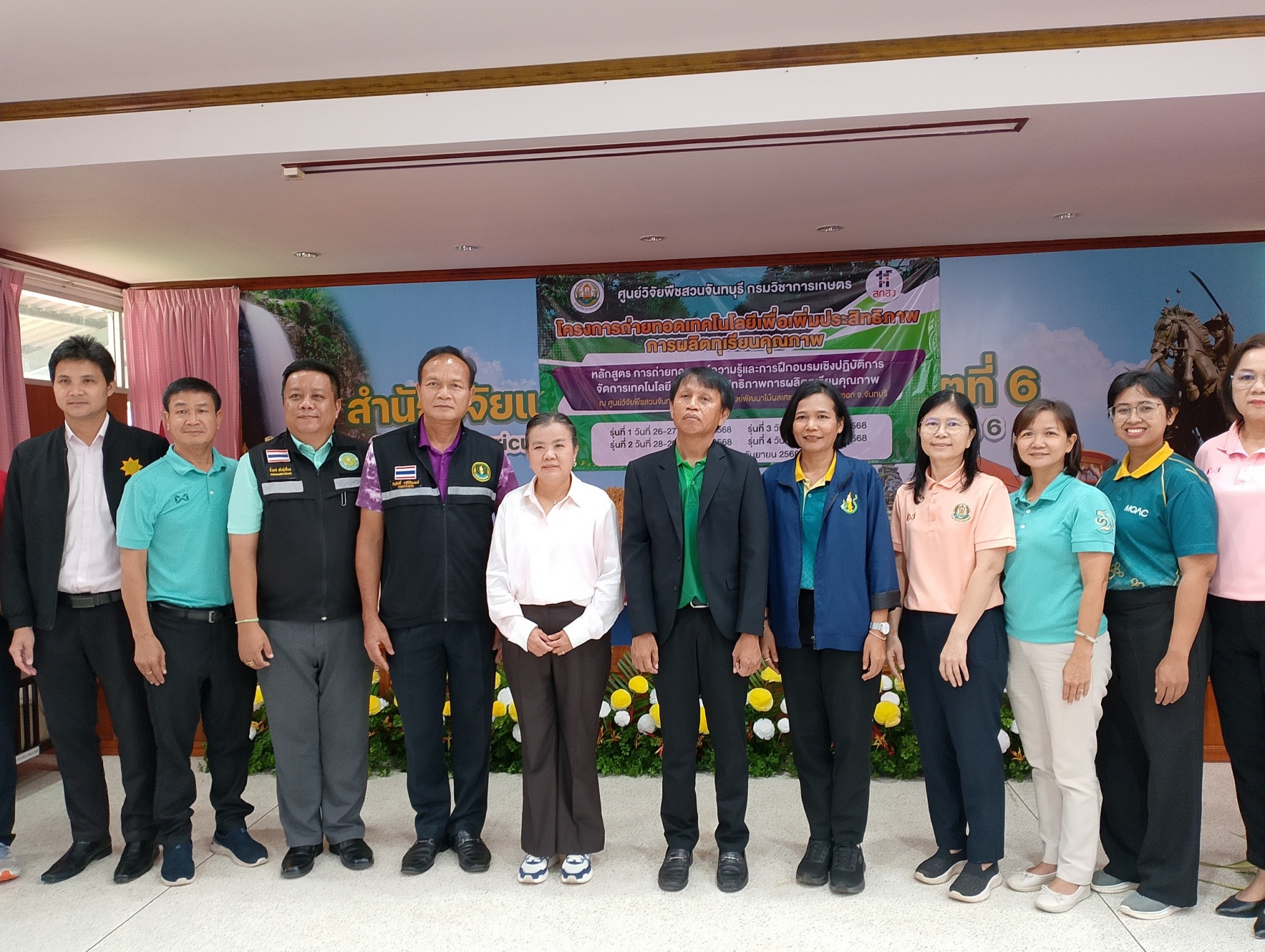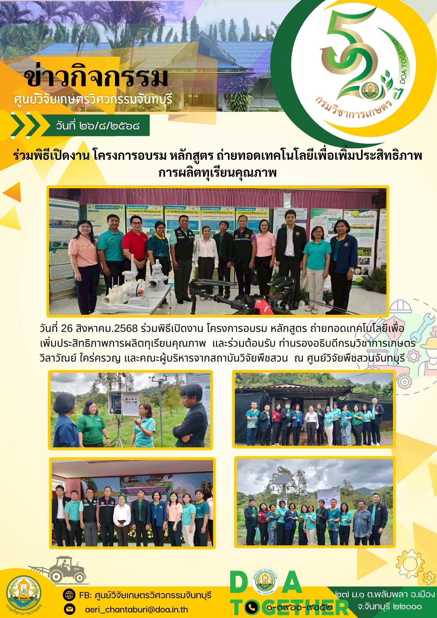 วันที่ 26 สิงหาคม.2568 ร่วมพิธีเปิดงาน โครงการอบรม หลักสูตร ถ่ายทอดเทคโนโลยีเพื่อเพิ่มประสิทธิภาพการผลิตทุเรียนคุณภาพ และร่วมต้อนรับ ท่านรองอธิบดีกรมวิชาการเกษตร วิลาวัณย์ ใคร่ครวญ และคณะผู้บริหารจากสถาบันวิจัยพืชสวน ณ ศูนย์วิจัยพืชสวนจันทบุรี
