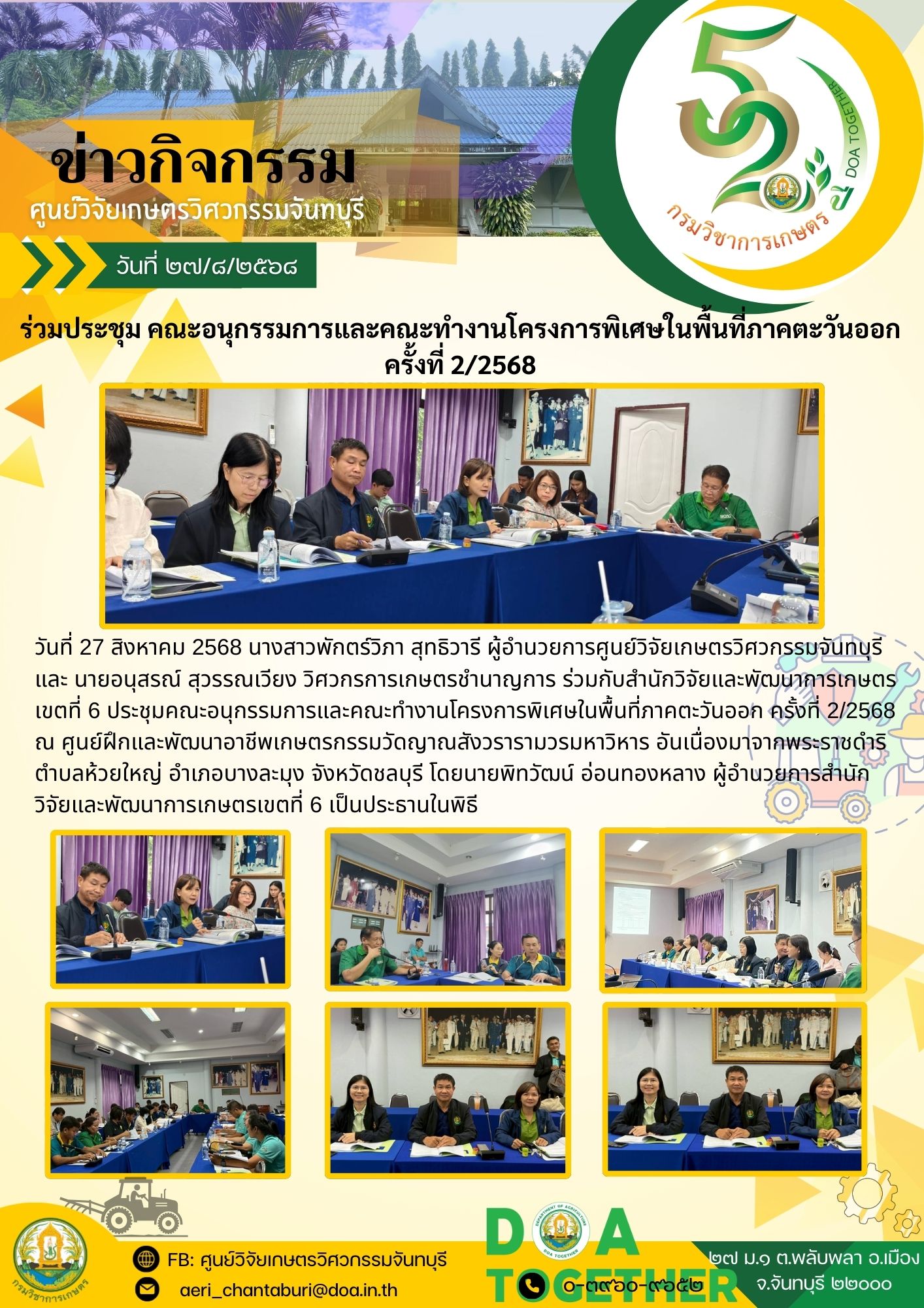 วันที่ 27 สิงหาคม 2568 นางสาวพักตร์วิภา สุทธิวารี ผู้อำนวยการศูนย์วิจัยเกษตรวิศวกรรมจันทบุรี และ นายอนุสรณ์ สุวรรณเวียง วิศวกรการเกษตรชำนาญการ ร่วมกับสำนักวิจัยและพัฒนาการเกษตรเขตที่ 6 ประชุมคณะอนุกรรมการและคณะทำงานโครงการพิเศษในพื้นที่ภาคตะวันออก ครั้งที่ 2/2568 ณ ศูนย์ฝึกและพัฒนาอาชีพเกษตรกรรมวัดญาณสังวรารามวรมหาวิหาร อันเนื่องมาจากพระราชดำริ ตำบลห้วยใหญ่ อำเภอบางละมุง จังหวัดชลบุรี โดยนายพิทวัฒน์ อ่อนทองหลาง ผู้อำนวยการสำนักวิจัยและพัฒนาการเกษตรเขตที่ 6 เป็นประธานในพิธี
