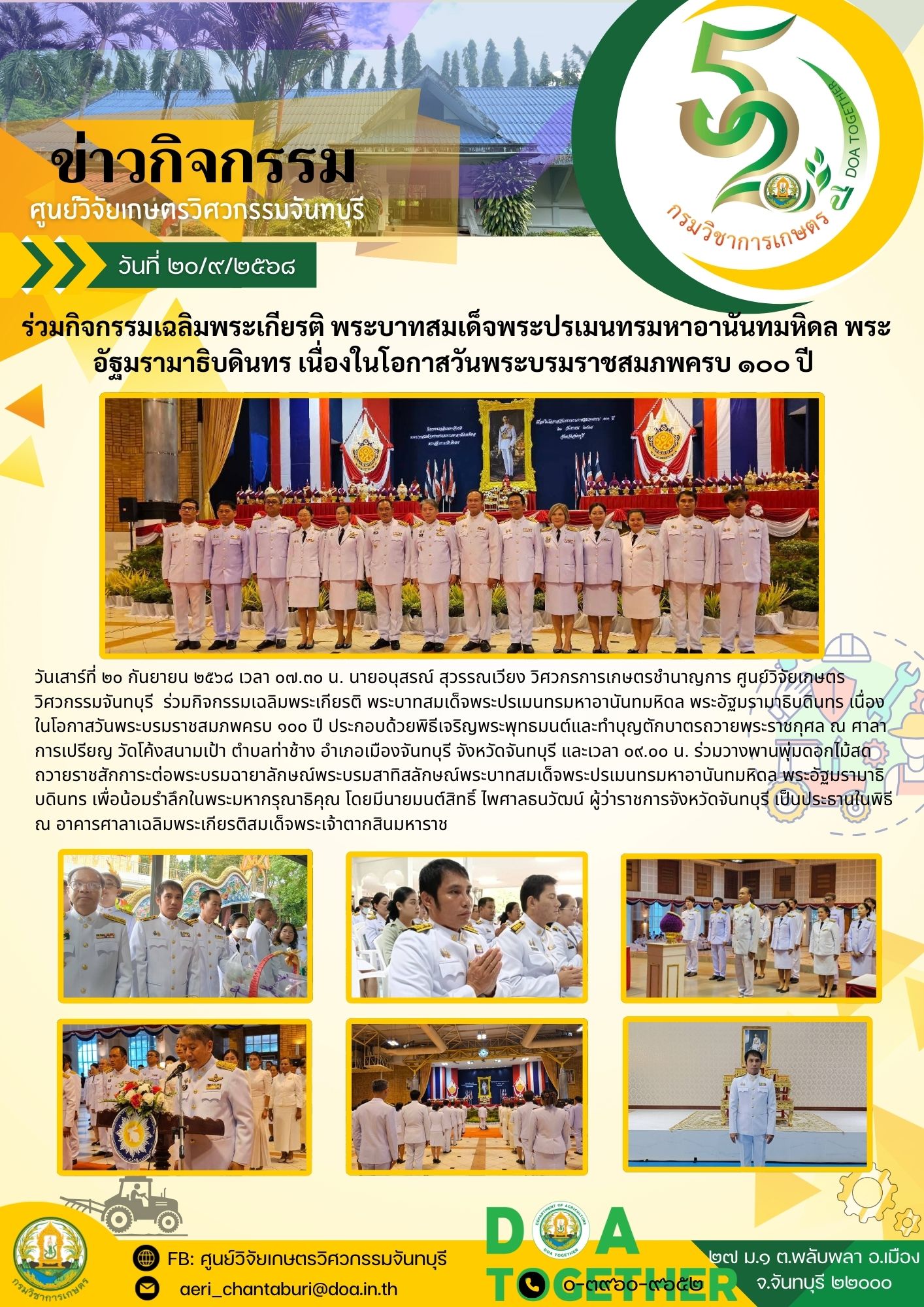 วันเสาร์ที่ 20 กันยายน 2568 เวลา 07.30 น. นายอนุสรณ์ สุวรรณเวียง ศูนย์วิจัยเกษตรวิศวกรรมจันทบุรี ร่วมกิจกรรมเฉลิมพระเกียรติ พระบาทสมเด็จพระปรเมนทรมหาอานันทมหิดล พระอัฐมรามาธิบดินทร เนื่องในโอกาสวันพระบรมราชสมภพครบ 100 ปี ประกอบด้วยพิธีเจริญพระพุทธมนต์และทำบุญตักบาตรถวายพระราชกุศล ณ ศาลาการเปรียญ วัดโค้งสนามเป้า ตำบลท่าช้าง อำเภอเมืองจันทบุรี จังหวัดจันทบุรี และเวลา 09.00 น. ร่วมวางพานพุ่มดอกไม้สด ถวายราชสักการะต่อพระบรมฉายาลักษณ์พระบรมสาทิสลักษณ์พระบาทสมเด็จพระปรเมนทรมหาอานันทมหิดล พระอัฐมรามาธิบดินทร เพื่อน้อมรำลึกในพระมหากรุณาธิคุณ โดยมีนายมนต์สิทธิ์ ไพศาลธนวัฒน์ ผู้ว่าราชการจังหวัดจันทบุรี เป็นประธานในพิธี ณ อาคารศาลาเฉลิมพระเกียรติสมเด็จพระเจ้าตากสินมหาราช