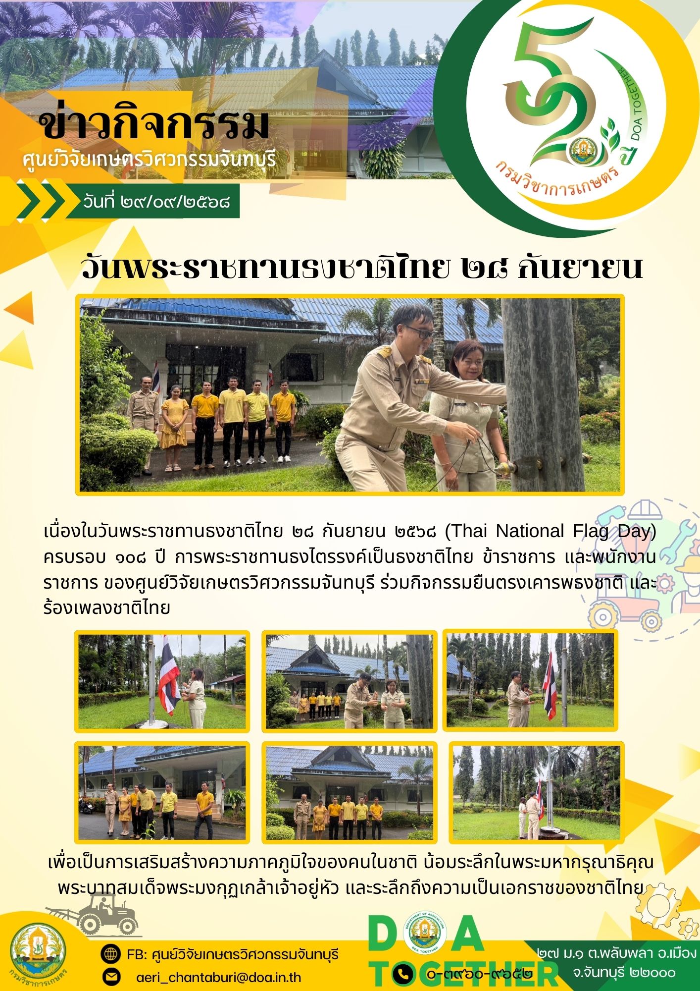 เนื่องในวันพระราชทานธงชาติไทย 28 กันยายน 2568 ครบรอบ 108 ปี การพระราชทานธงไตรรงค์เป็นธงชาติไทย ข้าราชการ และพนักงานราชการ ของศูนย์วิจัยเกษตรวิศวกรรมจันทบุรี ร่วมกิจกรรมยืนตรงเคารพธงชาติ และ ร้องเพลงชาติไทย เพื่อเป็นการเสริมสร้างความภาคภูมิใจของคนในชาติ น้อมระลึกในพระมหากรุณาธิคุณพระบาทสมเด็จพระมงกุฏเกล้าเจ้าอยู่หัว และระลึกถึงความเป็นเอกราชของชาติไทย