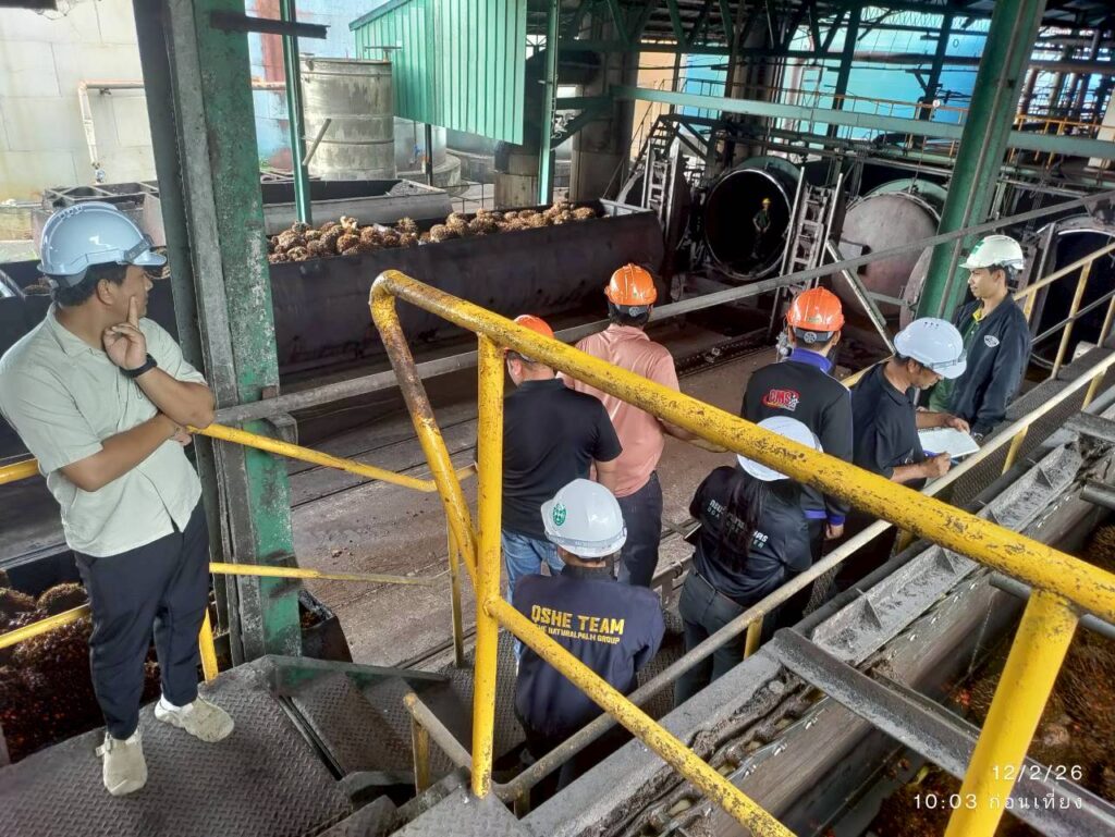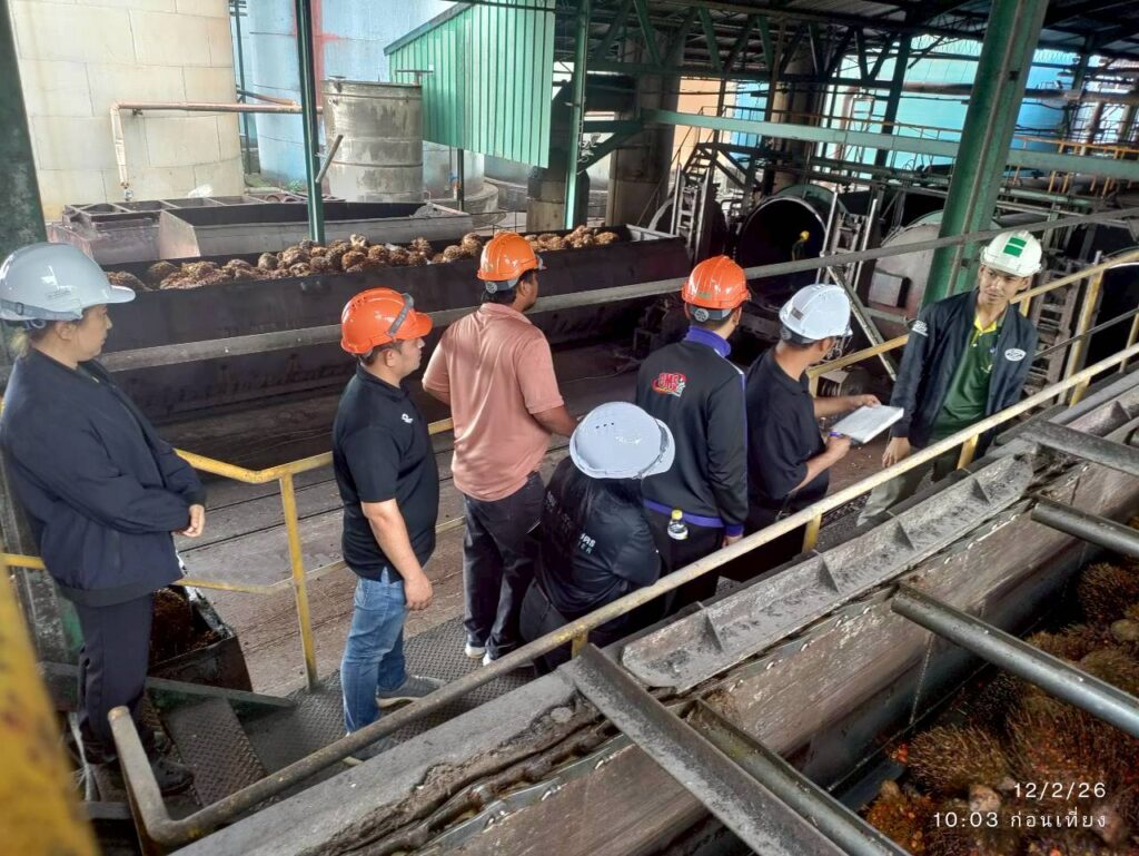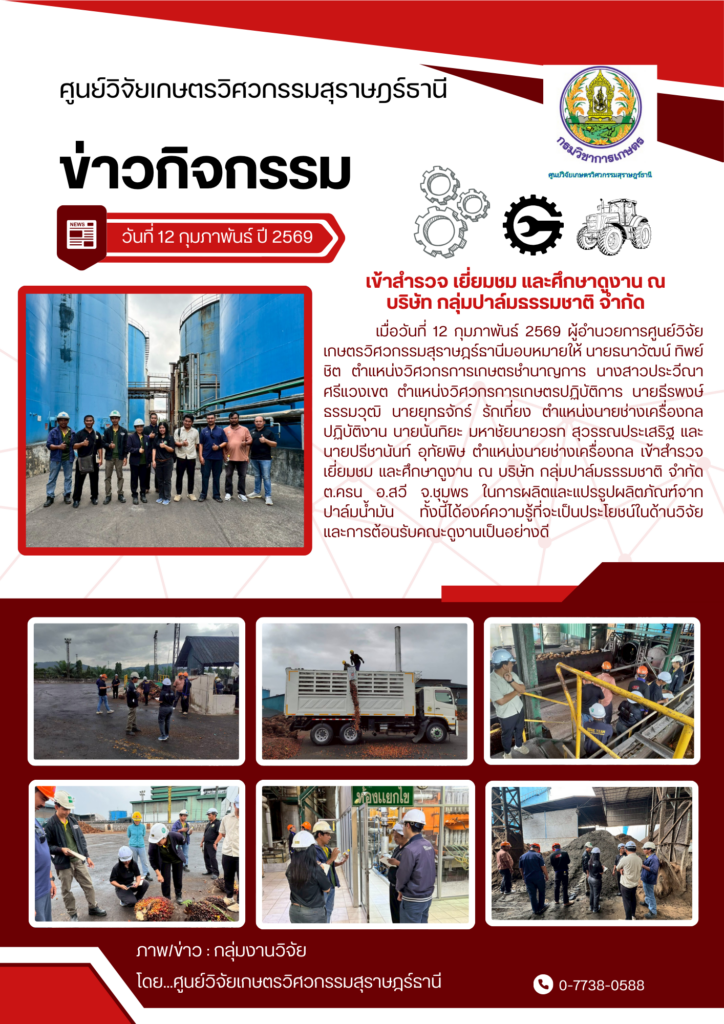 เมื่อวันที่ 12 กุมภาพันธ์ 2569 ผู้อำนวยการศูนย์วิจัยเกษตรวิศวกรรมสุราษฎร์ธานีมอบหมายให้ นายธนาวัฒน์ ทิพย์ชิต ตำแหน่งวิศวกรการเกษตรชำนาญการ นางสาวประวีณา ศรีแวงเขต ตำแหน่งวิศวกรการเกษตรปฏิบัติการ นายธีรพงษ์ ธรรมวุฒิ นายยุทธจักร์ รักเที่ยง ตำแหน่งนายช่างเครื่องกลปฏิบัติงาน นายนันทิยะ มหาชัย นายวรท สุวรรณประเสริฐ และ นายปรีชานันท์ อุทัยพิษ ตำแหน่งนายช่างเครื่องกล เข้าสำรวจ เยี่ยมชม และศึกษาดูงาน ณ บริษัท กลุ่มปาล์มธรรมชาติ จำกัด ต.ครน อ.สวี จ.ชุมพร ในการผลิตและแปรรูปผลิตภัณฑ์จากปาล์มน้ำมัน ทั้งนี้ได้องค์ความรู้ที่จะเป็นประโยชน์ในด้านวิจัย และการต้อนรับคณะดูงานเป็นอย่างดี