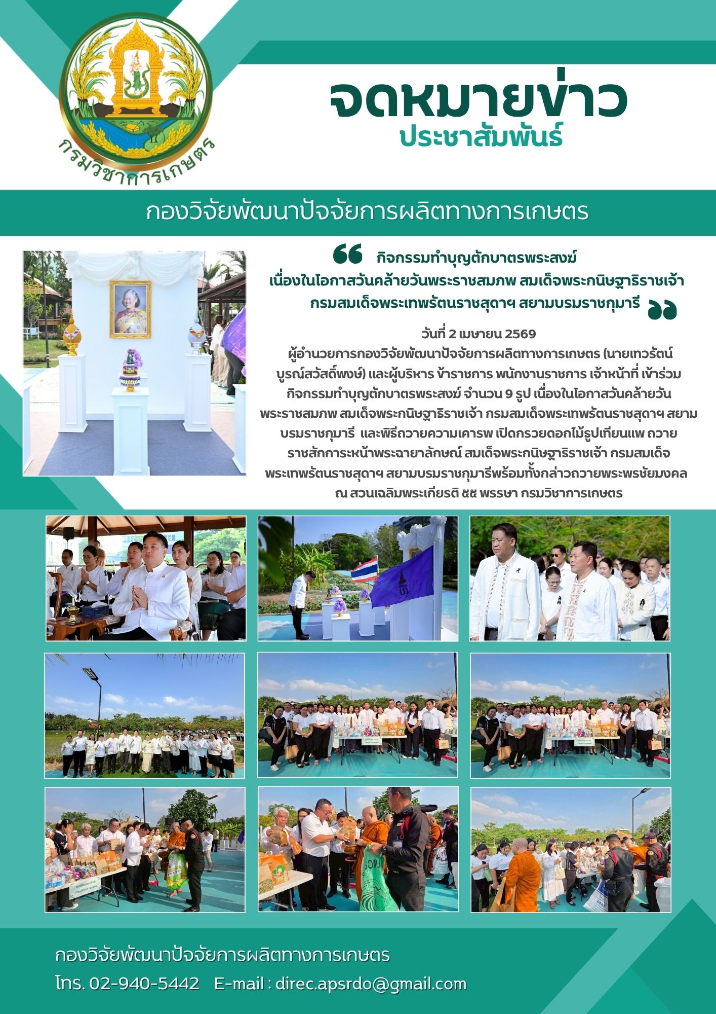 เข้าร่วมกิจกรรมทำบุญตักบาตรพระสงฆ์ จำนวน 9 รูป เนื่องในโอกาสวันคล้ายวันพระราชสมภพฯ 2 เมษายน 2569 admin ข่าวสาร 0 FacebookFacebookXXLINELine
