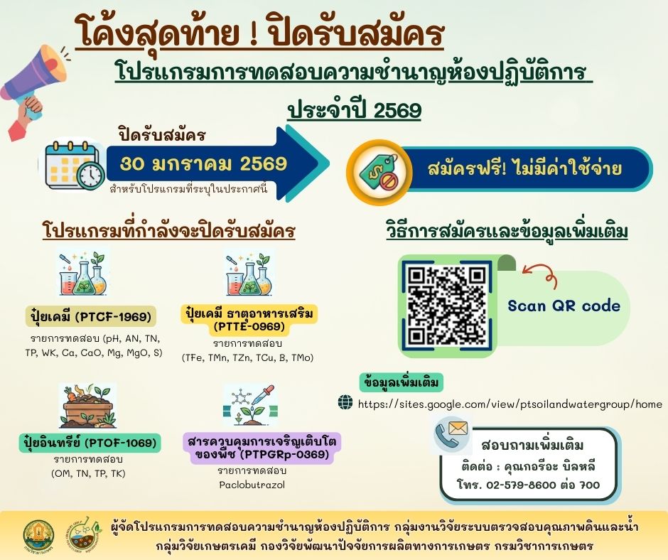 ประชาสัมพันธ์ แจ้งเตือนปิดรับสมัครโปรแกรมทดสอบความชำนาญห้องปฏิบัติการประจำปี 2569