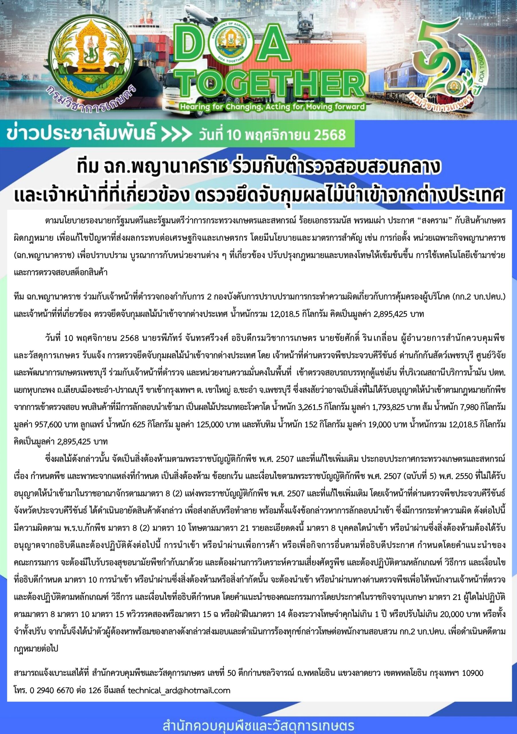 ทีม ฉก.พญานาคราช ร่วมกับเจ้าหน้าที่ตำรวจกองกำกับการ 2 กองบังคับการปราบปรามการกระทำความผิดเกี่ยวกับการคุ้มครองผู้บริโภค และเจ้าหน้าที่ที่เกี่ยวข้อง ตรวจยึดจับกุมผลไม้นำเข้าจากต่างประเทศ
