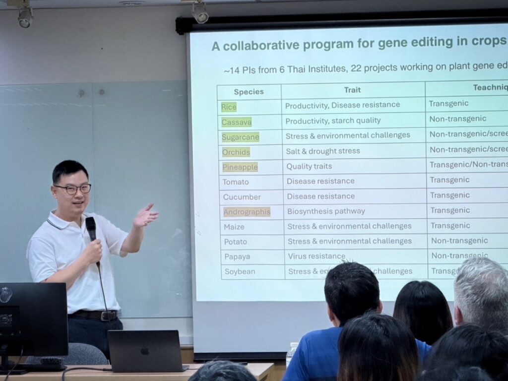 มีการบรรยายความรู้จากคุณ Kevin Diehl ผู้อำนวยการฝ่ายสนับสนุนด้านกฎระเบียบการแก้ไขจีโนมระดับโลก ของบริษัท คอร์เทวา อะกริไซเอนส์ ซึ่งได้บรรยายเกี่ยวกับการพัฒนาพืชด้วยเทคโนโลยีชีวภาพสมัยใหม่ อาทิ การพัฒนาข้าวโพดต้นเตี้ยด้วยเทคโนโลยีและการใช้ประโยชน์ทางการเกษตร สำหรับฝ่ายไทยโดยนางสาวอรุโณทัย ซาววา ผู้อำนวยการกลุ่มวิจัยพัฒนาการตรวจสอบพืชและจุลินทรีย์ดัดแปรพันธุกรรม ได้บรรยายเกี่ยวกับกฏระเบียบข้อบังคับ GEd ของประเทศไทยและแผนการพัฒนาพืชด้วยเทคโนโลยี GEd รศ.ดร.ศุภชัย วุฒิพงศ์ชัยกิจ บรรยายเกี่ยวกับการพัฒนาพืชด้วยเทคโนโลยี GEd ของมหาวิทยาลัยเกษตรศาสตร์รวมถึงงานวิจัย GEd ของประเทศไทย และ ดร.เมธินี ศรีวัฒนกุล นักวิชาการอิสระ ได้การแบ่งปันประสบการณ์เกี่ยวกับการขอนำเข้าพืชที่พัฒนาด้วยเทคโนโลยีชีวภาพสมัยใหม่ของประเทศไทย