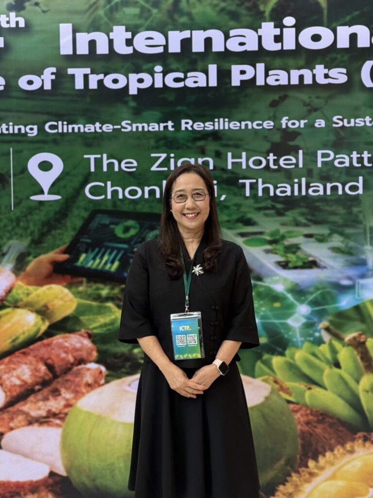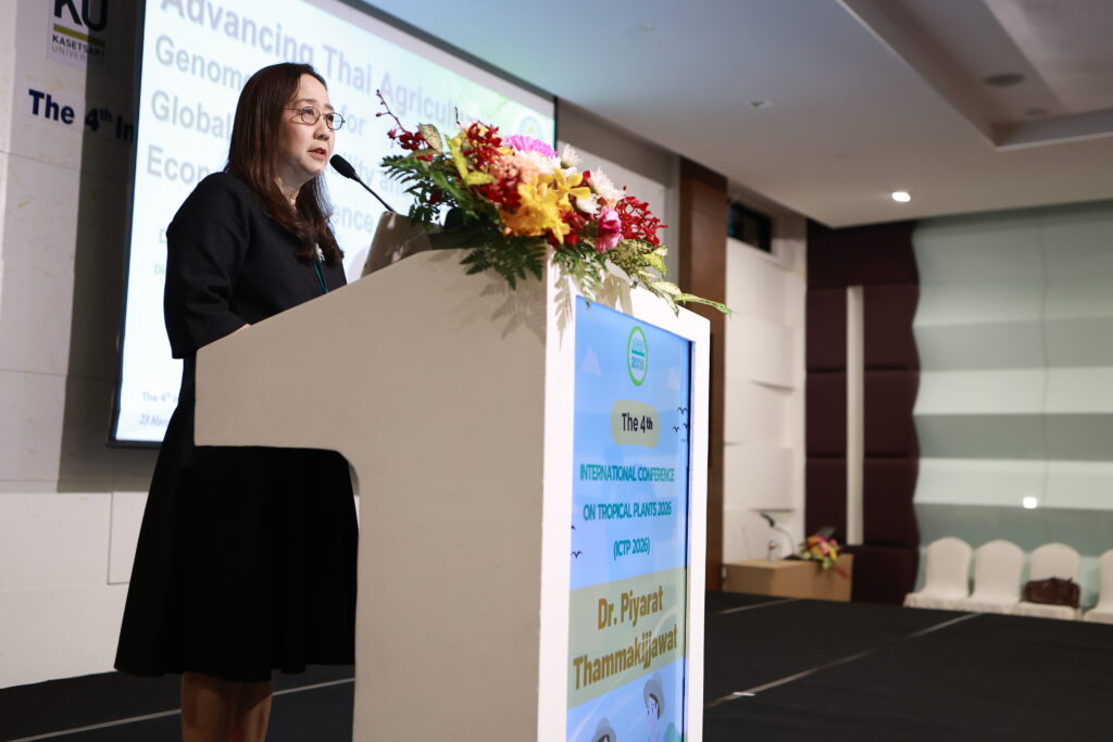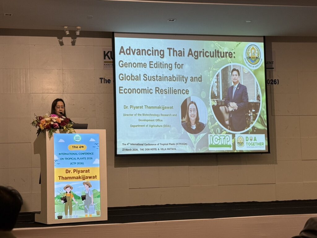 วันจันทร์ที่ 23 มีนาคม 2569 นายรพีภัทร์ จันทรศรีวงศ์ อธิบดีกรมวิชาการเกษตร มอบหมาย ดร. ปิยรัตน์ ธรรมกิจวัฒน์ ผู้อำนวยการกองวิจัยพัฒนาเทคโนโลยีชีวภาพ เป็นผู้แทนในฐานะวิทยากรหลักบรรยายพิเศษ หัวข้อ “Advancing Thai Agriculture: Gene Editing for Global Sustainability and Economic Resilience” ในงานประชุมวิชาการนานาชาติด้านพืชเมืองร้อน