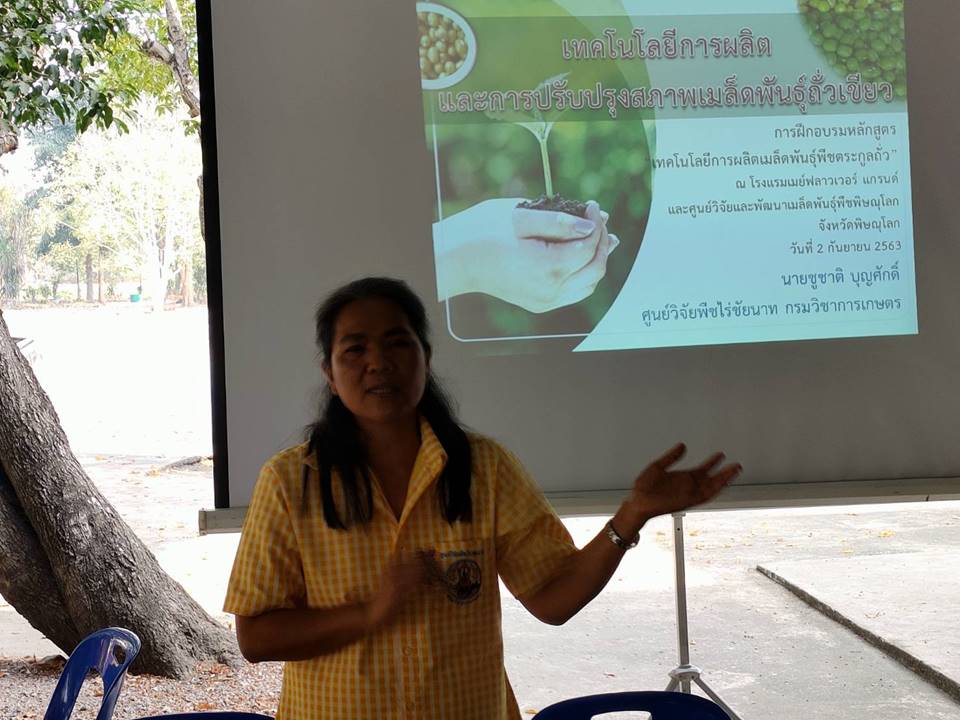 นางน้ำอ้อย นาคา นักวิชาการเกษตร เป็นวิทยากรบรรยายถ่ายทอดความรู้บรรยายในหัวข้อเรื่อง “เทคโนโลยีการผลิต สถานการณ์ใบด่างถั่วเขียว การป้องกันกำจัด และการปรับปรุงสภาพเมล็ดพันธุ์ถั่วเขียว” ภายใต้โครงการส่งเสริมการเพิ่มประสิทธิภาพการผลิตพืชตระกูลถั่วเพื่อความมั่นคงด้านอาหาร จัดโดยสำนักงานเกษตรอำเภอวัดสิงห์ จังหวัดชัยนาท ณ ศาลาการเปรียญวัดหนองแก หมู่ที่ 5 ตำบลหนองขุ่น อำเภอวัดสิงห์ จังหวัดชัยนาท เกษตรกรเข้าร่วมจำนวน 20 ราย