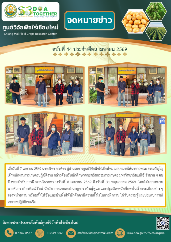 ผู้อำนวยการสถาบันวิจัยพืชไร่และพืชทดแทนพลังงาน ลงพื้นที่ติดตามความก้าวหน้างานวิจัย ศูนย์วิจัยพืชไร่เชียงใหม่