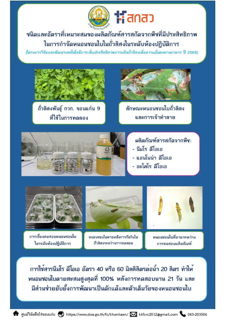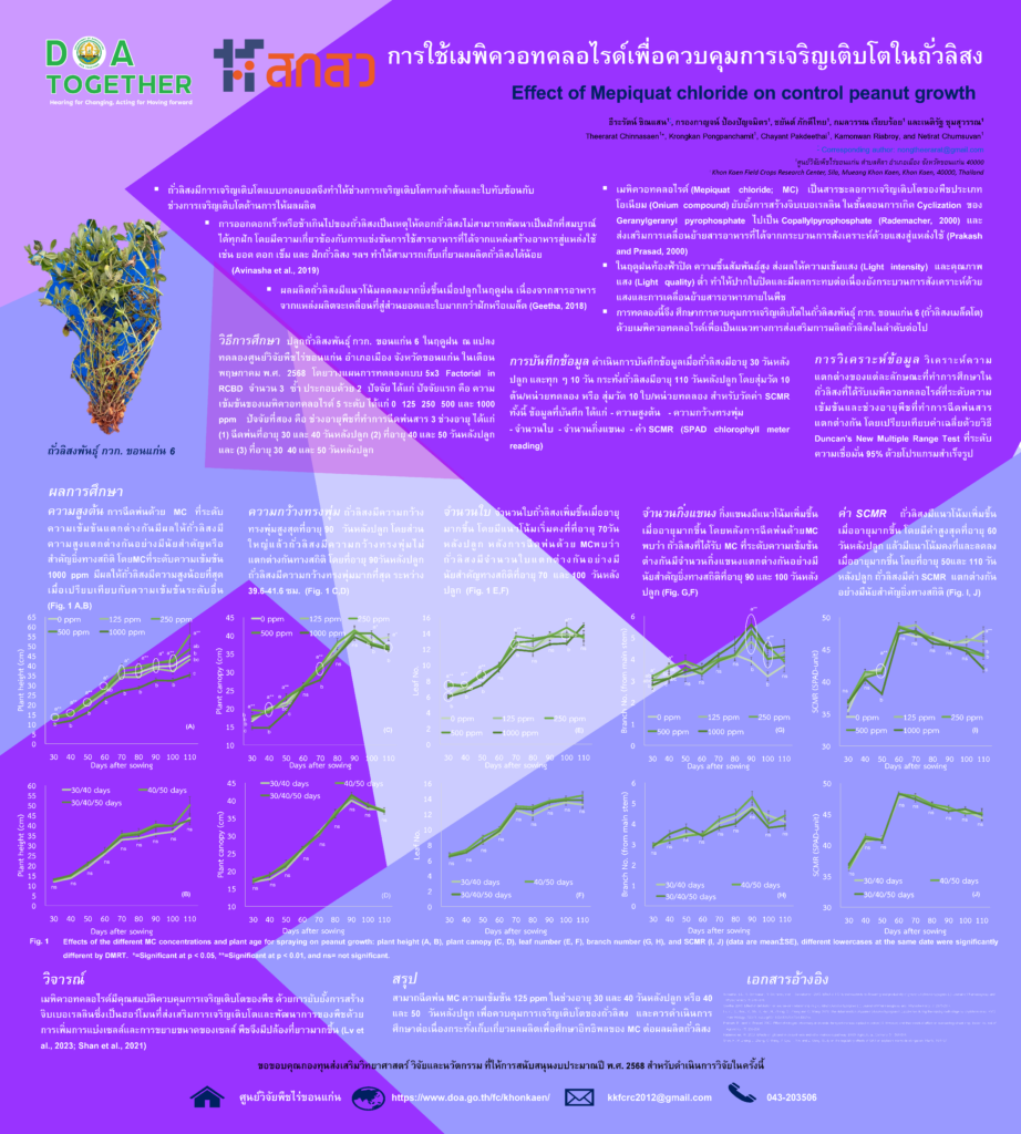 โปสเตอร์งานวิจัย พฤติกรรมการบริโภคน้ำอ้อยคั้นน้ำของผู้บริโภคในจังหวัดขอนแก่น การพัฒนาเทคนิค Multiplex-PCR ในการจำแนกเชื้อไฟโตพลาสมาสาเหตุโรคใบขาว โรคใบขาวแตกกอฝอย และโรคกอตะไคร้อ้อยในครั้งเดียว การระบุชนิดเชื้อสาเหตุโรคแส้ดำและโรคเน่าแดงในอ้อยโดยลักษณะสัณฐานวิทยาและวิธีอณูชีววิทยาและการพัฒนาการประเมินการเกิดโรคที่รวดเร็ว การจัดกลุ่มถั่วเขียว(Vigna radiata (L.) Wilczek) ต้านทานโรคราแป้งด้วยเครื่องหมายเอสเอสอาร์ ชนิดและอัตราที่เหมาะสมของผลิตภัณฑ์สารสกัดจากพืชที่มีประสิทธิภาพในการกำจัดหนอนชอนใบในถั่วลิสงในระดับห้องปฏิบัติการ การใช้เมพิควอทคลอไรด์เพื่อควบคุมการเจริญเติบโตในถั่วลิสง