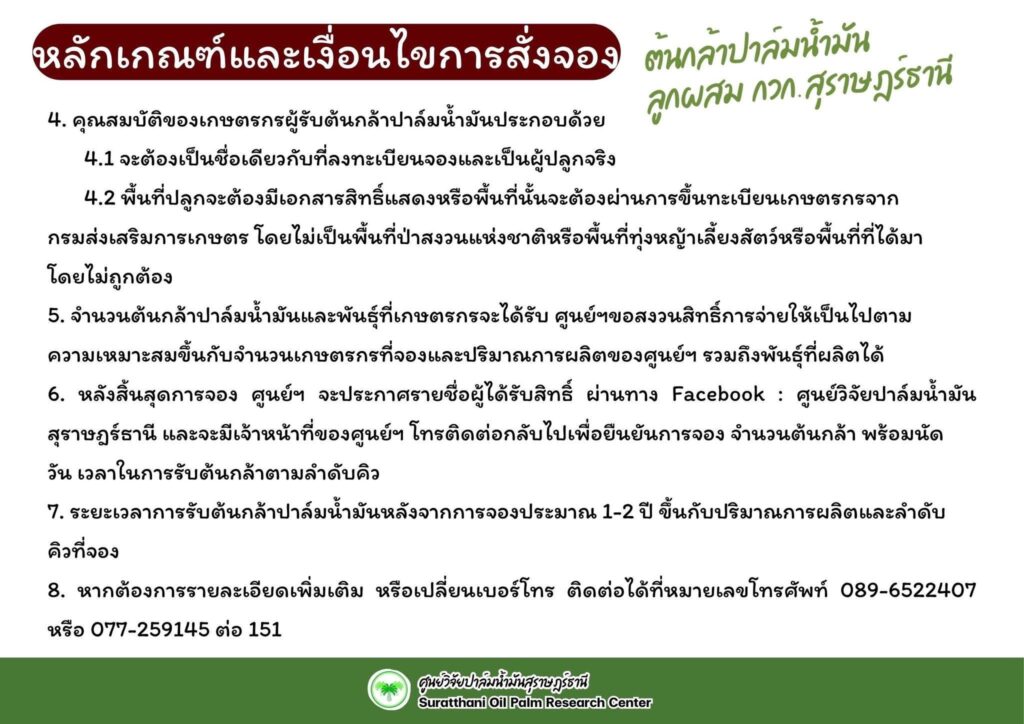 ประกาศเปิดจอง ต้นกล้าปาล์มน้ำมันลูกผสม กวก.สุราษฎร์ธานี (อายุ 8–12 เดือน)