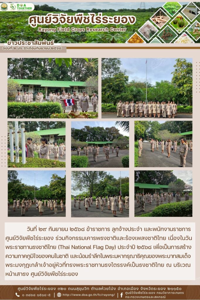วันที่ ๒๙ กันยายน ๒๕๖๘ ข้าราชการ ลูกจ้างประจำ และพนักงานราชการ ศูนย์วิจัยพืชไร่ระยอง ร่วมกิจกรรมเคารพธงชาติและร้องเพลงชาติไทย เนื่องในวันพระราชทานธงชาติไทย (Thai National Flag Day) ประจำปี ๒๕๖๘ เพื่อเป็นการสร้างความภาคภูมิใจของคนในชาติ และน้อมรำลึกในพระมหากรุณาธิคุณของพระบาทสมเด็จพระมงกุฎเกล้าเจ้าอยู่หัวที่ทรงพระราชทานธงไตรรงค์เป็นธงชาติไทย ณ บริเวณหน้าเสาธง ศูนย์วิจัยพืชไร่ระยอง