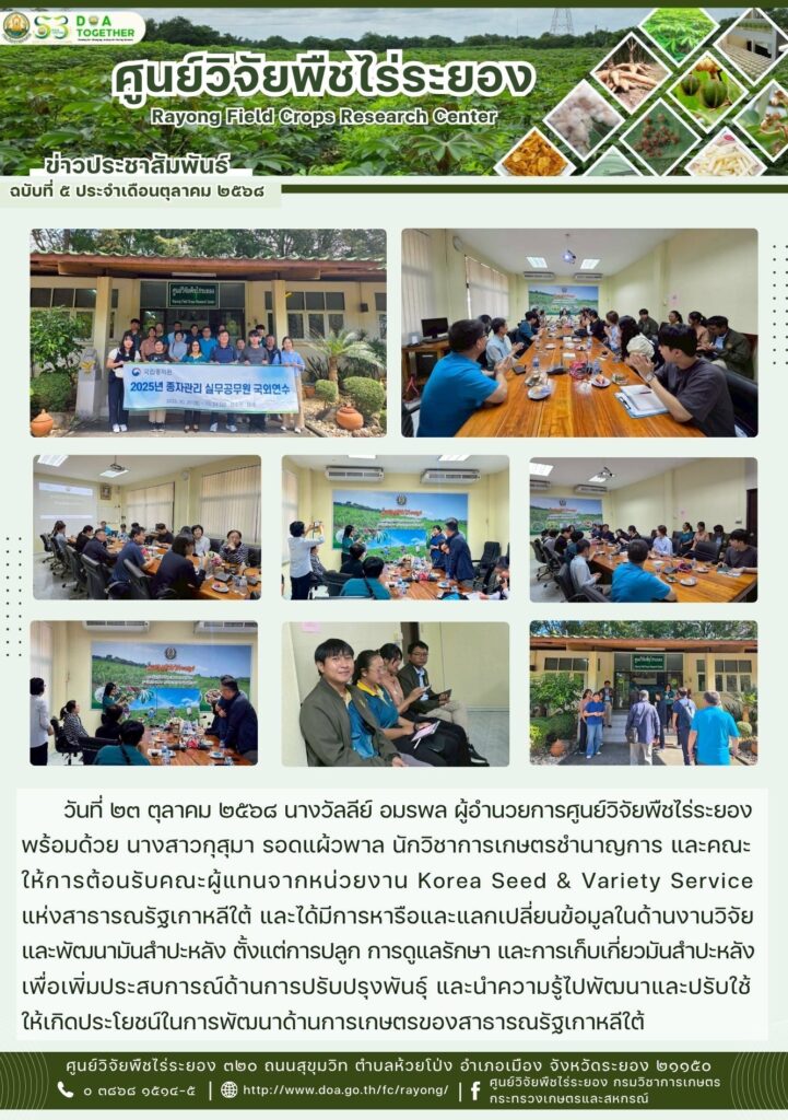 วันที่ ๒๓ ตุลาคม ๒๕๖๘ นางวัลลีย์ อมรพล ผู้อำนวยการศูนย์วิจัยพืชไร่ระยอง พร้อมด้วย นางสาวกุสุมา รอดแผ้วพาล นักวิชาการเกษตรชำนาญการ และคณะ ให้การต้อนรับคณะผู้แทนจากหน่วยงาน Korea Seed & Variety Service แห่งสาธารณรัฐเกาหลีใต้ และได้มีการหารือและแลกเปลี่ยนข้อมูลในด้านงานวิจัยและพัฒนามันสำปะหลัง ตั้งแต่การปลูก การดูแลรักษา และการเก็บเกี่ยวมันสำปะหลัง เพื่อเพิ่มประสบการณ์ด้านการปรับปรุงพันธุ์ และนำความรู้ไปพัฒนาและปรับใช้ให้เกิดประโยชน์ในการพัฒนาด้านการเกษตรของสาธารณรัฐเกาหลีใต้