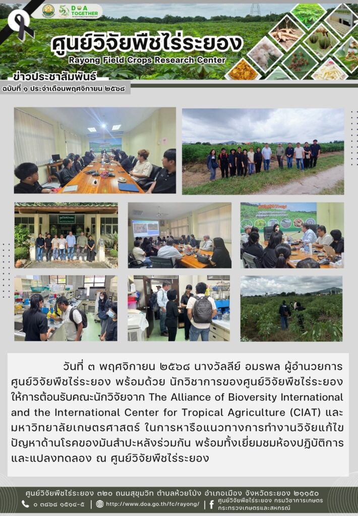 วันที่ ๓ พฤศจิกายน ๒๕๖๘ นางวัลลีย์ อมรพล ผู้อำนวยการศูนย์วิจัยพืชไร่ระยอง พร้อมด้วย นักวิชาการของศูนย์วิจัยพืชไร่ระยอง ให้การต้อนรับคณะนักวิจัยจาก The Alliance of Bioversity International and the International Center for Tropical Agriculture (CIAT) และมหาวิทยาลัยเกษตรศาสตร์ ในการหารือแนวทางการทำงานวิจัยแก้ไขปัญหาด้านโรคของมันสำปะหลังร่วมกัน พร้อมทั้งเยี่ยมชมห้องปฏิบัติการและแปลงทดลอง ณ ศูนย์วิจัยพืชไร่ระยอง