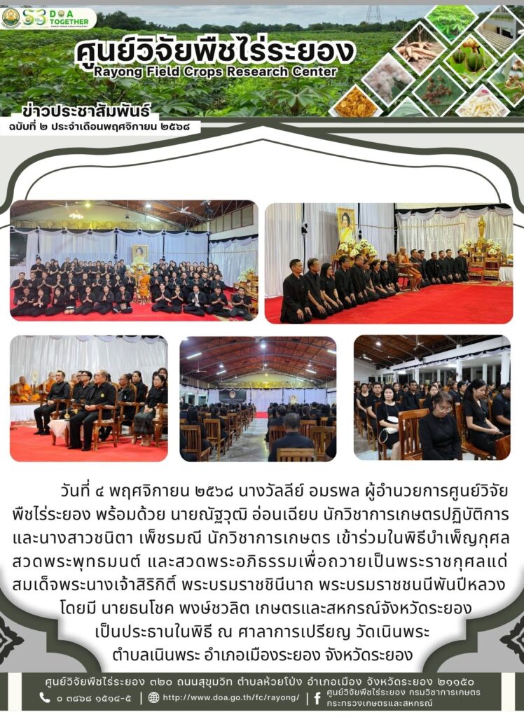 วันที่ ๔ พฤศจิกายน ๒๕๖๘ นางวัลลีย์ อมรพล ผู้อำนวยการศูนย์วิจัยพืชไร่ระยอง พร้อมด้วย นายณัฐวุฒิ อ่อนเฉียบ นักวิชาการเกษตรปฏิบัติการ และนางสาวชนิตา เพ็ชรมณี นักวิชาการเกษตร เข้าร่วมในพิธีบำเพ็ญกุศลสวดพระพุทธมนต์ และสวดพระอภิธรรมเพื่อถวายเป็นพระราชกุศลแด่สมเด็จพระนางเจ้าสิริกิติ์ พระบรมราชชินีนาถ พระบรมราชชนนีพันปีหลวง โดยมี นายธนโชค พงษ์ชวลิต เกษตรและสหกรณ์จังหวัดระยอง เป็นประธานในพิธี ณ ศาลาการเปรียญ วัดเนินพระ ตำบลเนินพระ อำเภอเมืองระยอง จังหวัดระยอง