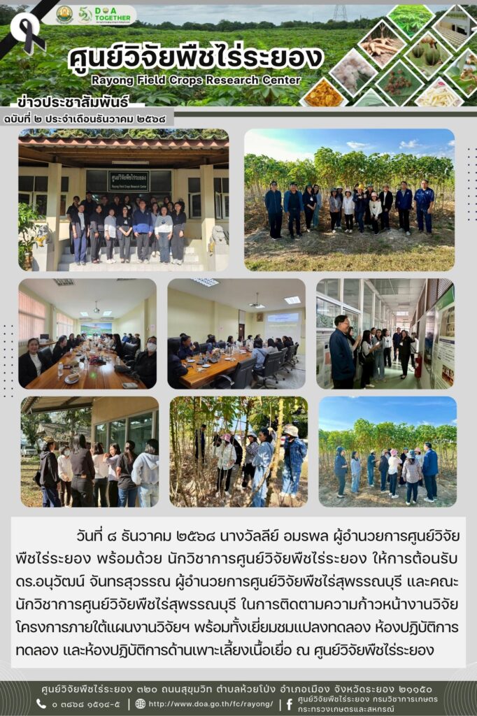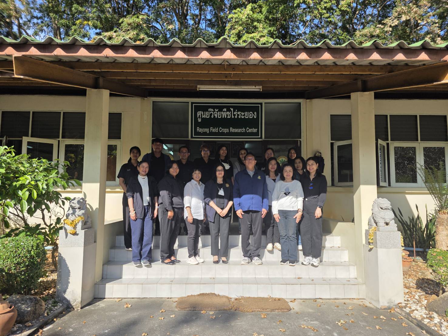 วันที่ ๘ ธันวาคม ๒๕๖๘ นางวัลลีย์ อมรพล ผู้อำนวยการศูนย์วิจัยพืชไร่ระยอง พร้อมด้วย นักวิชาการศูนย์วิจัยพืชไร่ระยอง ให้การต้อนรับ ดร.อนุวัฒน์ จันทรสุวรรณ ผู้อำนวยการศูนย์วิจัยพืชไร่สุพรรณบุรี และคณะนักวิชาการศูนย์วิจัยพืชไร่สุพรรณบุรี ในการติดตามความก้าวหน้างานวิจัยโครงการภายใต้แผนงานวิจัยฯ พร้อมทั้งเยี่ยมชมแปลงทดลอง ห้องปฏิบัติการทดลอง และห้องปฏิบัติการด้านเพาะเลี้ยงเนื้อเยื่อ ณ ศูนย์วิจัยพืชไร่ระยอง