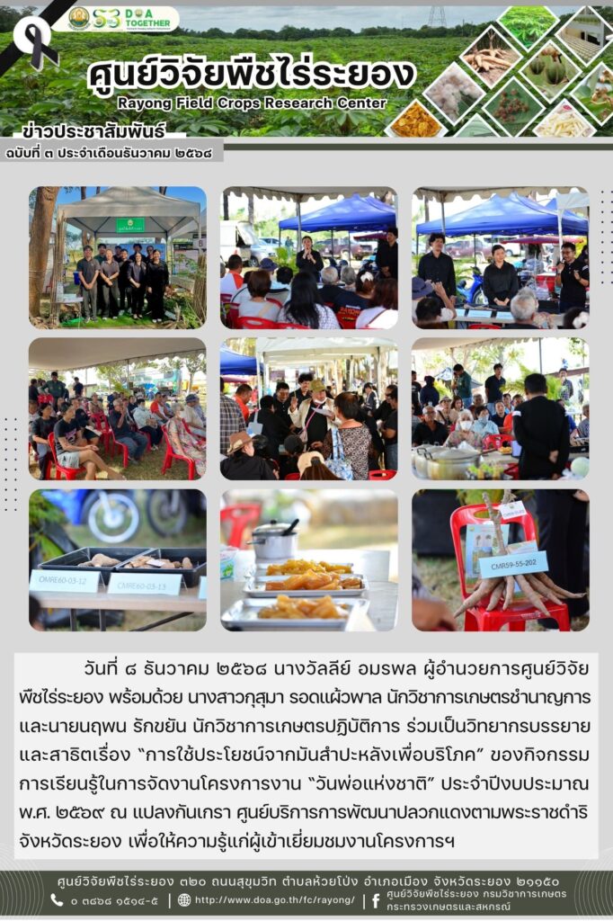 วันที่ ๘ ธันวาคม ๒๕๖๘ นางวัลลีย์ อมรพล ผู้อำนวยการศูนย์วิจัยพืชไร่ระยอง พร้อมด้วย นางสาวกุสุมา รอดแผ้วพาล นักวิชาการเกษตรชำนาญการ และนายนฤพน รักขยัน นักวิชาการเกษตรปฏิบัติการ ร่วมเป็นวิทยากรบรรยายและสาธิตเรื่อง “การใช้ประโยชน์จากมันสำปะหลังเพื่อบริโภค” ของกิจกรรมการเรียนรู้ในการจัดงานโครงการงาน “วันพ่อแห่งชาติ” ประจำปีงบประมาณ พ.ศ. ๒๕๖๙ ณ แปลงกันเกรา ศูนย์บริการการพัฒนาปลวกแดงตามพระราชดำริ จังหวัดระยอง เพื่อให้ความรู้แก่ผู้เข้าเยี่ยมชมงานโครงการฯ