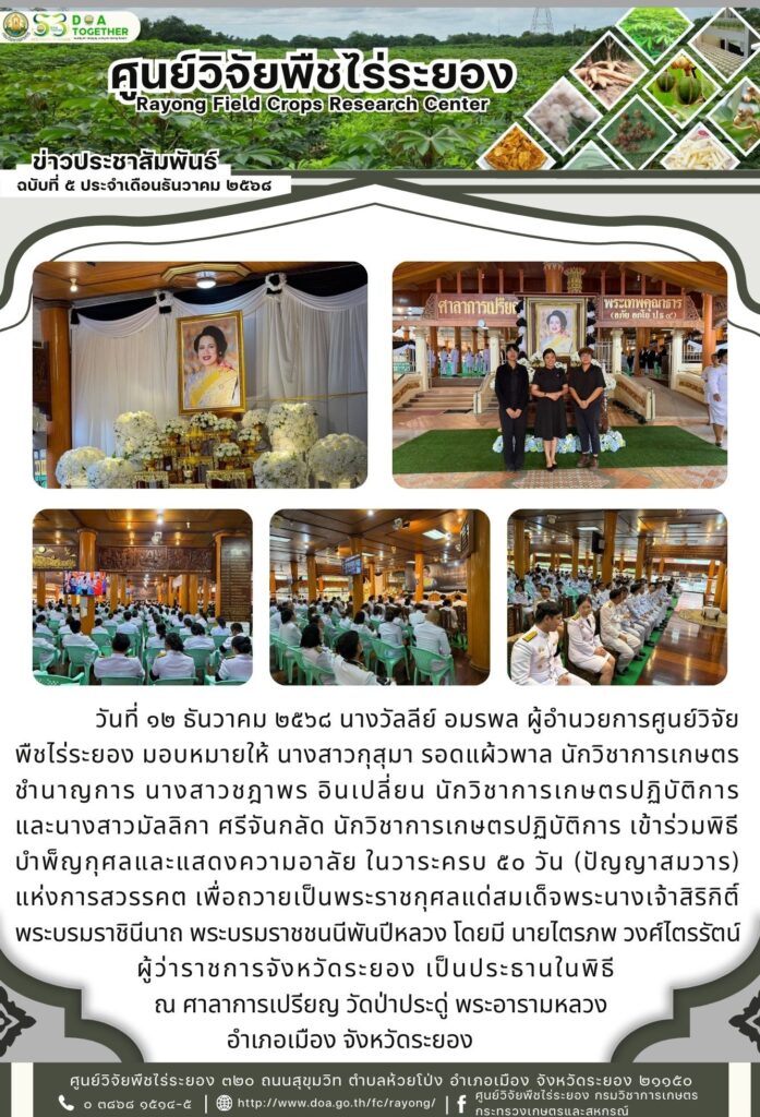 วันที่ ๑๒ ธันวาคม ๒๕๖๘ นางวัลลีย์ อมรพล ผู้อำนวยการศูนย์วิจัยพืชไร่ระยอง มอบหมายให้ นางสาวกุสุมา รอดแผ้วพาล นักวิชาการเกษตรชำนาญการ นางสาวชฎาพร อินเปลี่ยน นักวิชาการเกษตรปฏิบัติการ และนางสาวมัลลิกา ศรีจันกลัด นักวิชาการเกษตรปฏิบัติการ เข้าร่วมพิธีบำพ็ญกุศลและแสดงความอาลัย ในวาระครบ ๕๐ วัน (ปัญญาสมวาร) แห่งการสวรรคต เพื่อถวายเป็นพระราชกุศลแด่สมเด็จพระนางเจ้าสิริกิติ์ พระบรมราชินีนาถพระบรมราชชนนีพันปีหลวง โดยมี นายไตรภพ วงศ์ไตรรัตน์ ผู้ว่าราชการจังหวัดระยอง เป็นประธานในพิธี ณ ศาลาการเปรียญ วัดป่าประดู่ พระอารามหลวง อำเภอเมือง จังหวัดระยอง