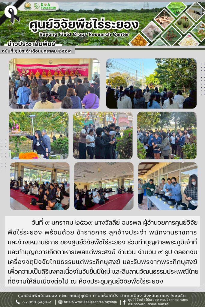 วันที่ ๙ มกราคม ๒๕๖๙ นางวัลลีย์ อมรพล ผู้อำนวยการศูนย์วิจัยพืชไร่ระยอง พร้อมด้วย ข้าราชการ ลูกจ้างประจำ พนักงานราชการ และจ้างเหมาบริการ ของศูนย์วิจัยพืชไร่ระยอง ร่วมสักการะศาลพระภูมิเจ้าที่ และสิ่งศักดิ์สิทธิ์ประจำศูนย์ฯ พร้อมทั้งทำบุญถวายภัตตาหารเพลแด่พระสงฆ์ จำนวน ๙ รูป ตลอดจนเครื่องจตุปัจจัยไทยธรรมแด่พระภิกษุสงฆ์ และรับพรจากพระภิกษุสงฆ์ เพื่อความเป็นสิริมงคลเนื่องในวันขึ้นปีใหม่และสืบสานวัฒนธรรมประเพณีไทยที่ดีงามให้สืบเนื่องต่อไป ณ ห้องประชุมศูนย์วิจัยพืชไร่ระยอง