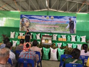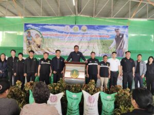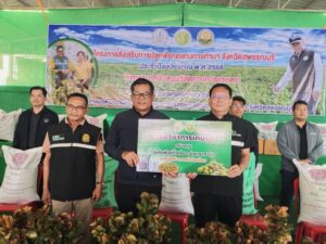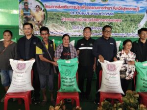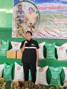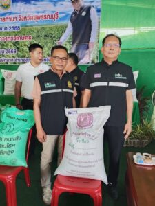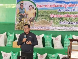 วันที่ 24 พฤศจิกายน 2568 นายรพีภัทร์ จันทรศรีวงศ์ อธิบดีกรมวิชาการเกษตร มอบหมายให้ นายอนุวัฒน์ จันทรสุวรรณ ผู้อำนวยการศูนย์วิจัยพืชไร่สุพรรณบุรี นายฉลอง เกิดศรี ผู้อำนวยการศูนย์วิจัยพืชไร่ชัยนาท และนางสาวระพีพันธุ์ ชั่งใจ นักวิชาการเกษตรชำนาญการพิเศษ ร่วมเป็นเกียรติในการมอบเมล็ดพันธุ์ถั่วเขียวแก่เกษตรกรผู้เข้าร่วมโครงการส่งเสริมการปลูกพืชทดแทนการทำนาจังหวัดสุพรรณบุรี ซึ่งมีการบูรณาการร่วมกันระหว่างกรมวิชาการเกษตรและกรมส่งเสริมการเกษตร ทั้งนี้ กรมวิชาการเกษตร สนับสนุ่นเมล็ดพันธุ์ถั่วเขียว กวก.ชัยนาท 72 จำนวน 5,000 กิโลกรัม และปุ๋ยชีวภาพไรโซเบียมสำหรับถั่วเขียว จำนวน 300 ถุง โดยมี นายรพีทัศน์ อุ่นจิตตพันธ์ รองอธิบดีกรมส่งเสริมการเกษตรเป็นประธานในพิธี ณ องค์การบริหารส่วนตำบลหนองผักนาก อำเภอสามชุก จังหวัดสุพรรณบุรี และมีเกษตรกรในพื้นที่อำเภอเมืองสุพรรณบุรี ดอนเจดีย์ สามชุก เดิมบางนางบวช อู่ทอง และหนองหญ้าไซ จังหวัดสุพรรณบุรี เข้าร่วมโครงการฯ จำนวน 500 ราย