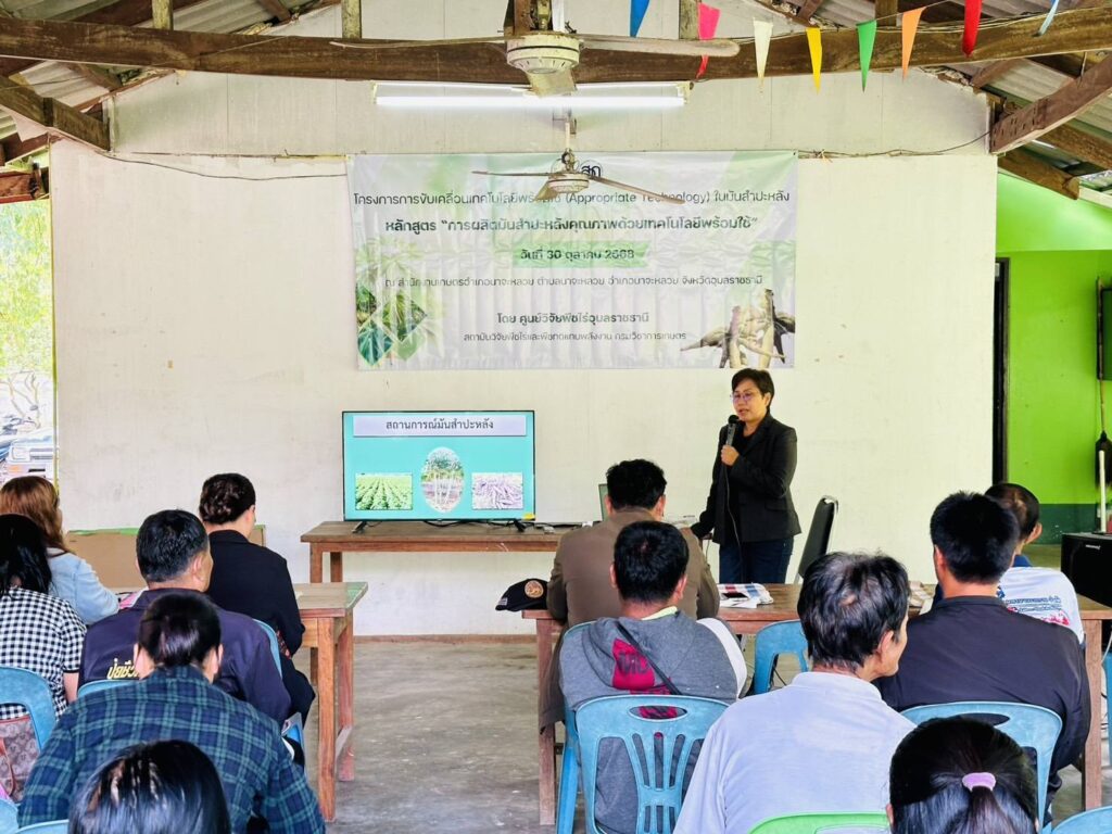 วันที่ 30 ตุลาคม 2568 นางสาวจิราลักษณ์ ภูมิไธสง ผู้อำนวยการศูนย์วิจัยพืชไร่อุบลราชธานี มอบหมายให้ นางสาวมลุลี บุญเรือง นักวิชาการเกษตรปฏิบัติการ พร้อมด้วยคณะเจ้าหน้าที่ ศูนย์วิจัยพืชไร่อุบลราชธานี จัดฝึกอบรม หลักสูตร “การผลิตมันสำปะหลังคุณภาพด้วยเทคโนโลยีพร้อมใช้” ภายใต้โครงการ การขับเคลื่อนเทคโนโลยีพร้อมใช้ (Appropriate Technology) ในมันสำปะหลัง ณ สำนักงานเกษตรอำเภอนาจะหลวย ตำบลนาจะหลวย อำเภอนาจะหลวย จังหวัดอุบลราชธานี เกษตรกรเข้ารับการอบรม จำนวน 40 ราย