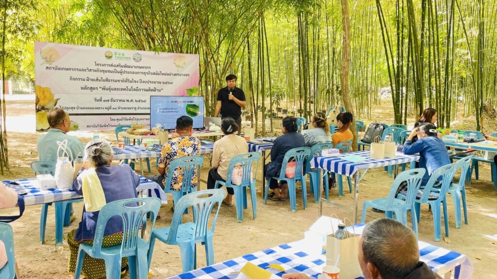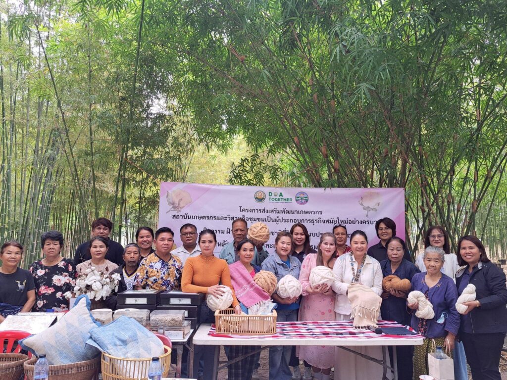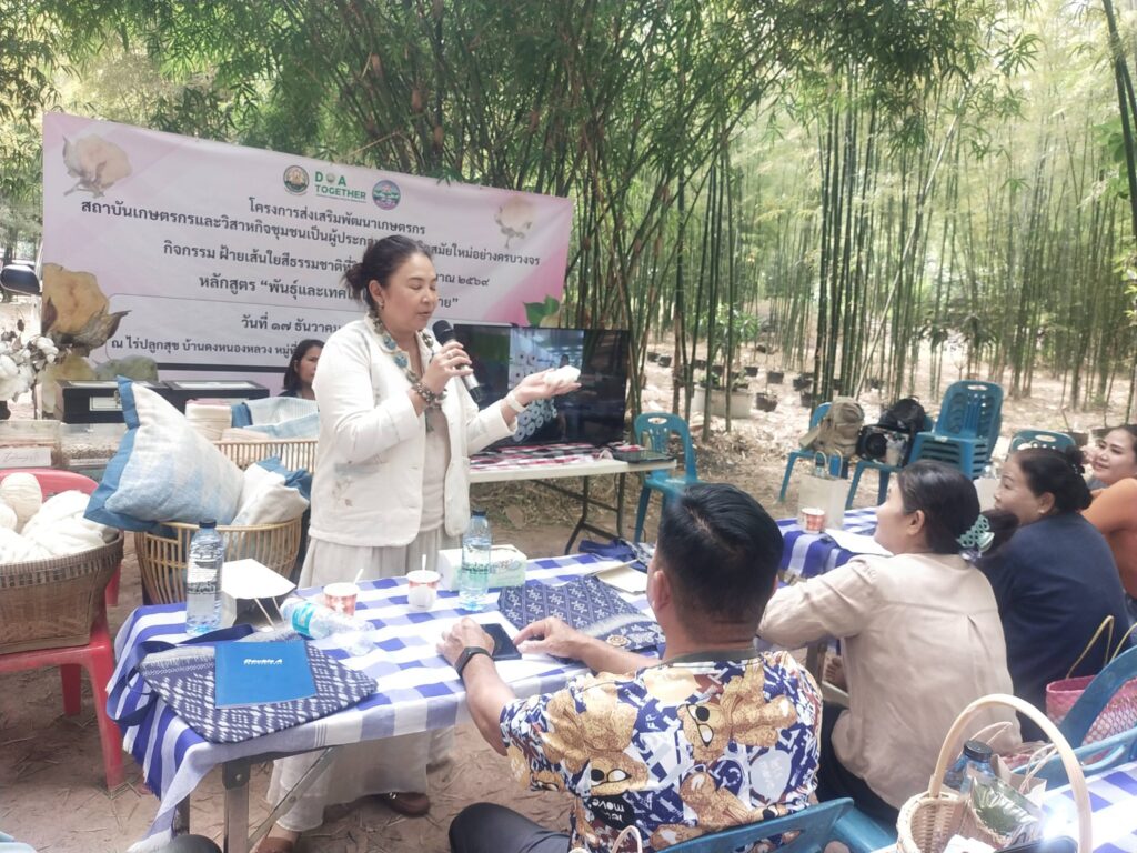 วันที่ 17 ธันวาคม 2568 นางสาวจิราลักษณ์ ภูมิไธสง ผู้อำนวยการศูนย์วิจัยพืชไร่อุบลราชธานี มอบหมายให้ นางจุไรรัตน์ หวังเป็น นักวิชาการเกษตรชำนาญการพิเศษ พร้อมด้วย คณะเจ้าหน้าที่ ศูนย์วิจัยพืชไร่อุบลราชธานี จัดฝึกอบรม หลักสูตร “พันธุ์และเทคโนโลยีการผลิตฝ้าย” ภายใต้งบประมาณจังหวัดอุบลราชธานี ประจำปี 2569 โครงการส่งเสริมพัฒนาเกษตรกรสถาบันเกษตรกรและวิสาหกิจชุมชนเป็นผู้ประกอบการธุรกิจสมัยใหม่อย่างครบวงจร กิจกรรมฝ้ายเส้นใยสีธรรมชาติที่ริมโขง ณ ไร่ปลูกสุขบ้านดงหนองหลวง หมู่ที่ 14 ตำบลเขมราฐ อำเภอเขมราฐ จังหวัดอุบลราชธานี เกษตรกรเข้ารับการอบรมจำนวน 20 ราย