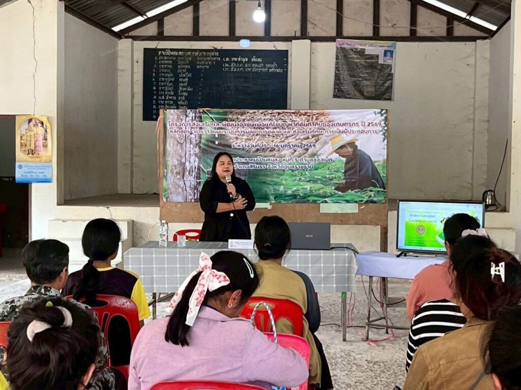 วันที่ 16 มกราคม 2569 นางสาวจิราลักษณ์ ภูมิไธสง ผู้อำนวยการศูนย์วิจัยพืชไร่อุบลราชธานี มอบหมายให้ นางสาวอรอนงค์ วรรณวงษ์ นักวิชาการเกษตรชำนาญการพิเศษ และนายสาคร รจนัย นักวิชาการเกษตรชำนาญการ เป็นวิทยากรอบรม เรื่อง “การผลิตมันสำปะหลังให้มีคุณภาพ การวางแผนการตลาด เสริมทักษะการเป็นผู้ประกอบการมันสำปะหลัง” ภายใต้โครงการส่งเสริมพัฒนาอาชีพ เพื่อแก้ไขปัญหาที่ดินทำกินของเกษตรกร ปี 2569 จัดโดย สำนักงานสหกรณ์จังหวัดอุบลราชธานี ณ ศาลาประชาคมบ้านหินสูง หมู่ที่ 5 ตำบลช่องเม็ก อำเภอสิรินธร จังหวัดอุบลราชธานี เกษตรกรเข้ารับการอบรมจำนวน 15 ราย