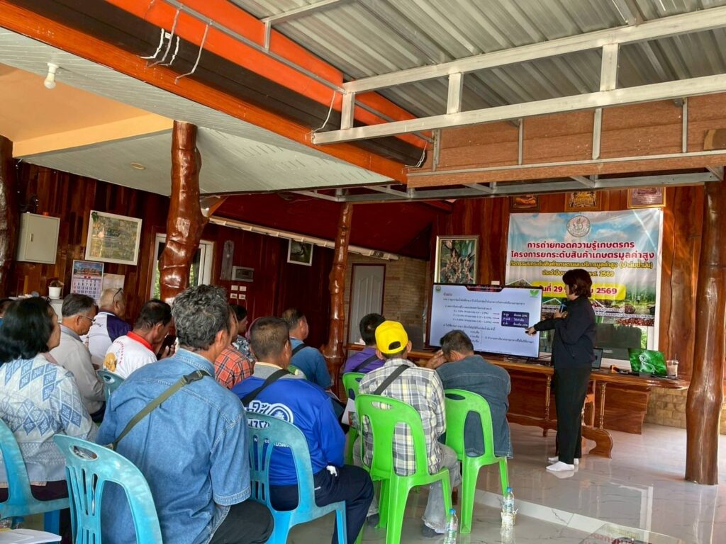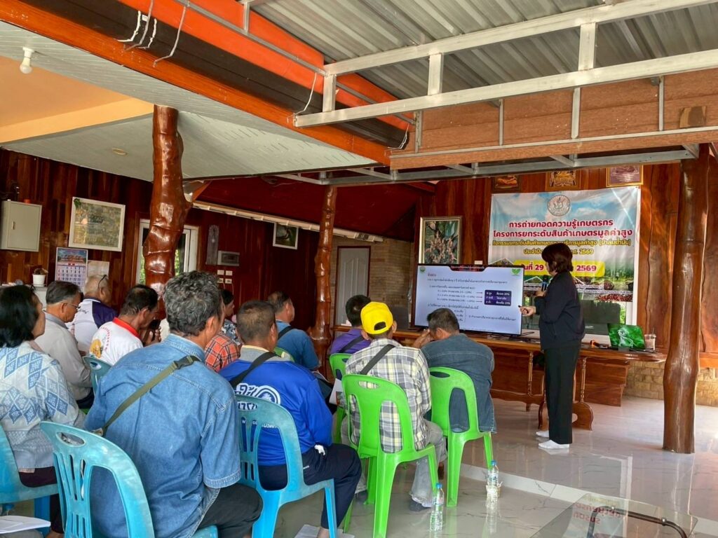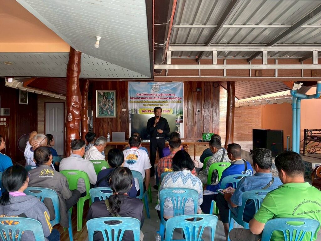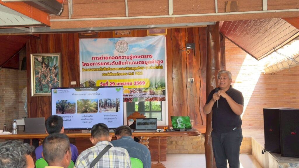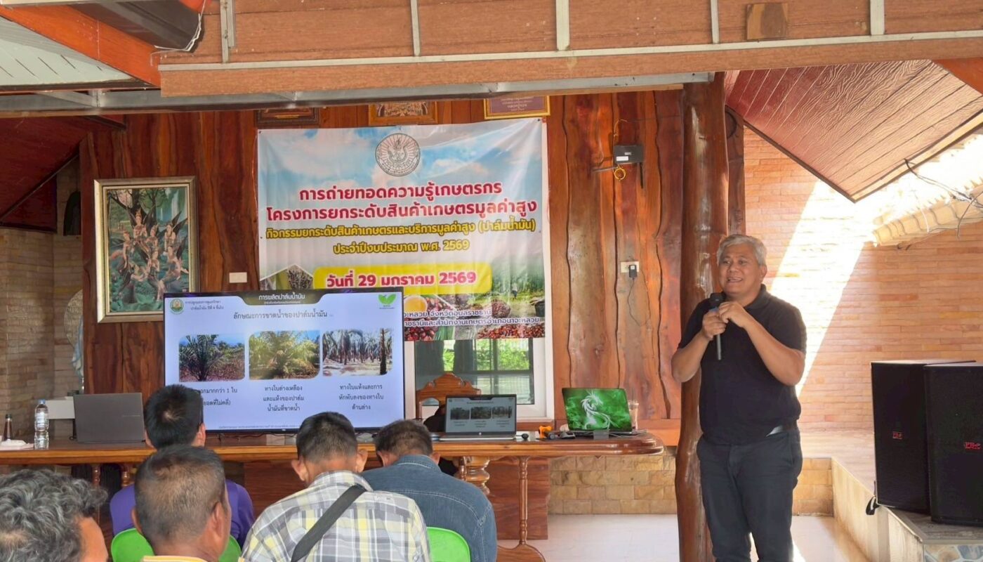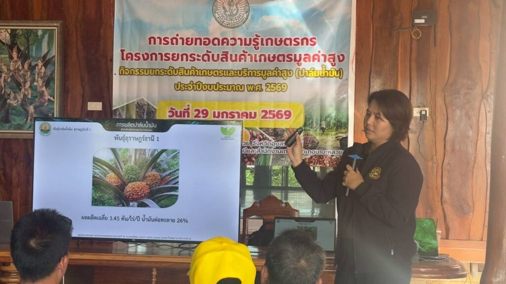 วันที่ 29 มกราคม 2569 นางสาวจิราลักษณ์ ภูมิไธสง ผู้อำนวยการศูนย์วิจัยพืชไร่อุบลราชธานี มอบหมายให้ นายสาคร รจนัย นักวิชาการเกษตรชำนาญการ และนางสาวศรัญจิต ชนะสุวรรณ นักวิชาการเกษตรปฏิบัติการ เป็นวิทยากรอบรมเกษตรกรสมาชิกกลุ่มแปลงใหญ่ปาล์มน้ำมัน เรื่อง “การจัดการสวนปาล์มน้ำมัน และการใช้ปุ๋ยอย่างเหมาะสมตามผลการวิเคราะห์ดินและใบปาล์มน้ำมันควบคู่กับการให้น้ำ เพื่อเพิ่มผลผลิตปาล์มน้ำมันอย่างยั่งยืน” ภายใต้โครงการยกระดับสินค้าเกษตรมูลค่าสูง กิจกรรม ยกระดับสินค้าเกษตรและบริการมูลค่าสูง (ปาล์มน้ำมัน) ประจำปีงบประมาณ พ.ศ. 2569 จัดโดย สำนักงานเกษตรจังหวัดอุบลราชธานี ณ บ้านตูม หมู่ 10 ตำบลนาจะหลวย อำเภอนาจะหลวย จังหวัดอุบลราชธานี เกษตรกรเข้ารับการอบรม จำนวน 30 ราย