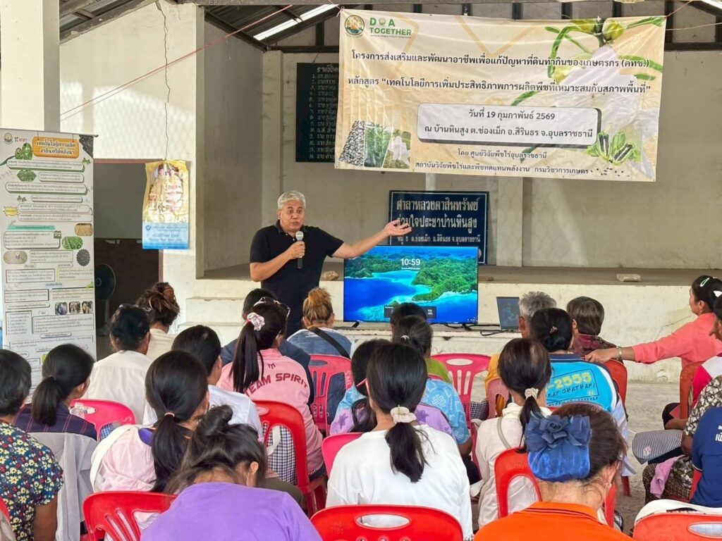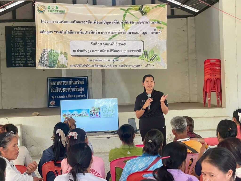 วันที่ 19 กุมภาพันธ์ 2569 นางสาวจิราลักษณ์ ภูมิไธสง ผู้อำนวยการศูนย์วิจัยพืชไร่อุบลราชธานี มอบหมายให้ นายสาคร รจนัย นักวิชาการเกษตรชำนาญการ พร้อมด้วยคณะเจ้าหน้าที่ศูนย์วิจัยพืชไร่อุบลราชธานี จัดฝึกอบรม หลักสูตร “เทคโนโลยีการเพิ่มประสิทธิภาพการผลิตงาที่เหมาะสมกับสภาพพื้นที่” ภายใต้ โครงการส่งเสริมและพัฒนาอาชีพเพื่อแก้ปัญหาที่ดินทำกินของเกษตรกร (คทช.) ปีงบประมาณ 2569 ณ บ้านหินสูง ตำบลช่องเม็ก อำเภอสิรินธร จังหวัดอุบลราชธานี เกษตรกรเข้ารับการอบรมจำนวน 25 ราย