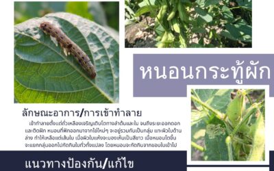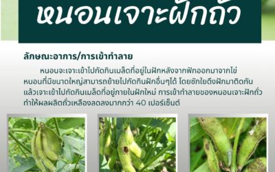 เตือนภัยพืช 01/04/2026 admin เตือนภัยการเกษตร เกษตรกรผู้ปลูกถั่วเหลืองในระยะฝักเต็ม – ฝักแก่ ให้ระวังการเข้าทำลายของ หนอนเจาะฝักถั่ว ให้หมั่นสำรวจแปลงปลูกหากพบลักษณะอาการหรือการเข้าทำลายให้รีบทำการป้องกันกำจัดตามคำแนะนำเพื่อไม่ให้ส่งผลกระทบต่อผลผลิตถั่วเหลือง Read More