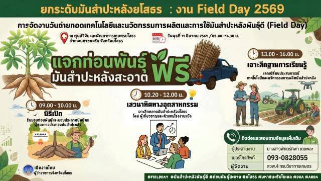 ข่าวประชาสัมพันธ์ 18/02/2026 admin สถาบันวิจัยพืชไร่และพืชทดแทนพลังงาน ร่วมกับสำนักวิจัยและพัฒนาการเกษตรเขตที่ 4 จัดงานวันถ่ายทอดเทคโนโลยีและนวัตกรรมการผลิต การใช้มันสำปะหลังพันธุ์ดี วันที่ 11 มีนาคม 2569 ณ ศูนย์วิจัยและพัฒนาการเกษตรยโสธร Read More
