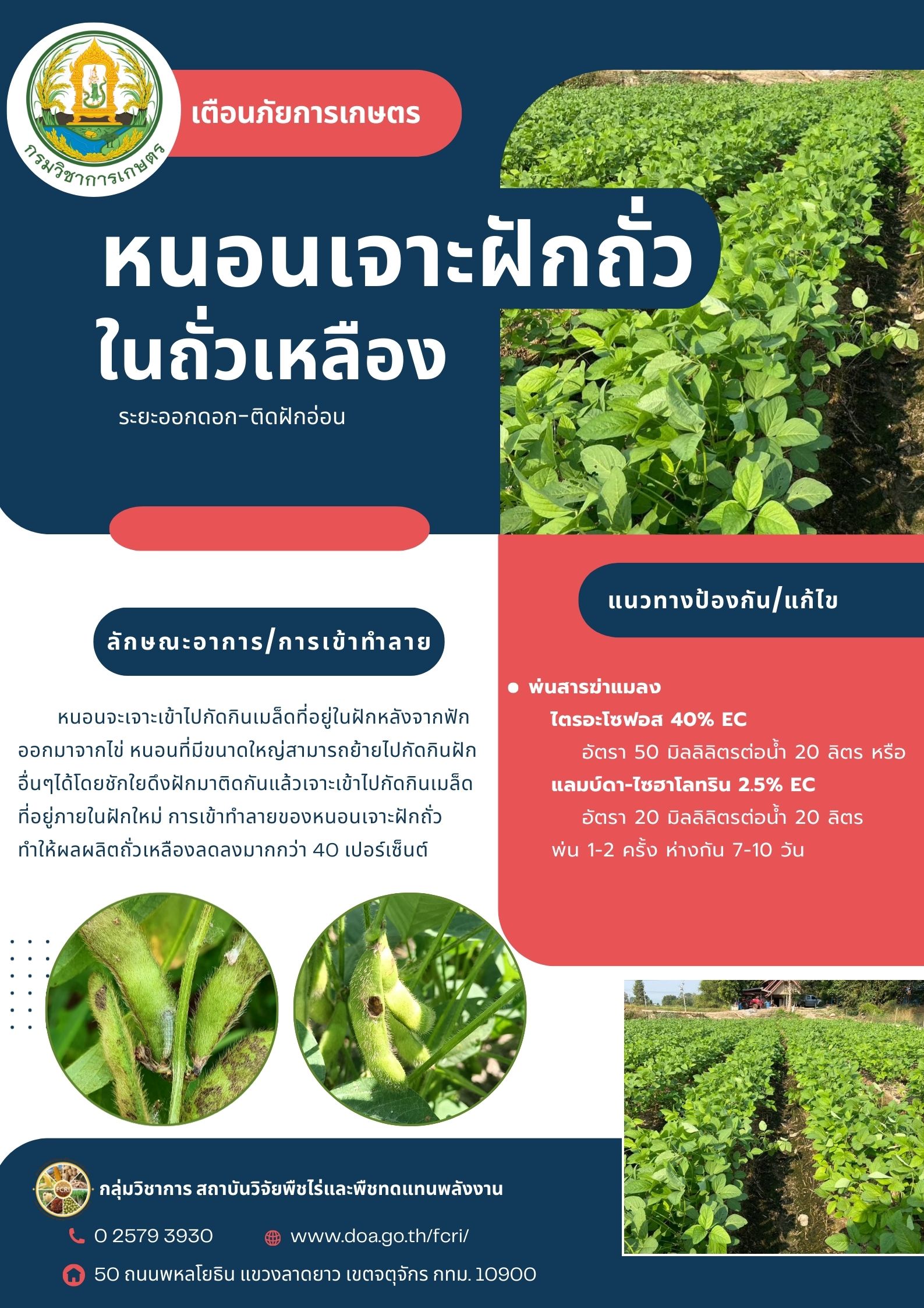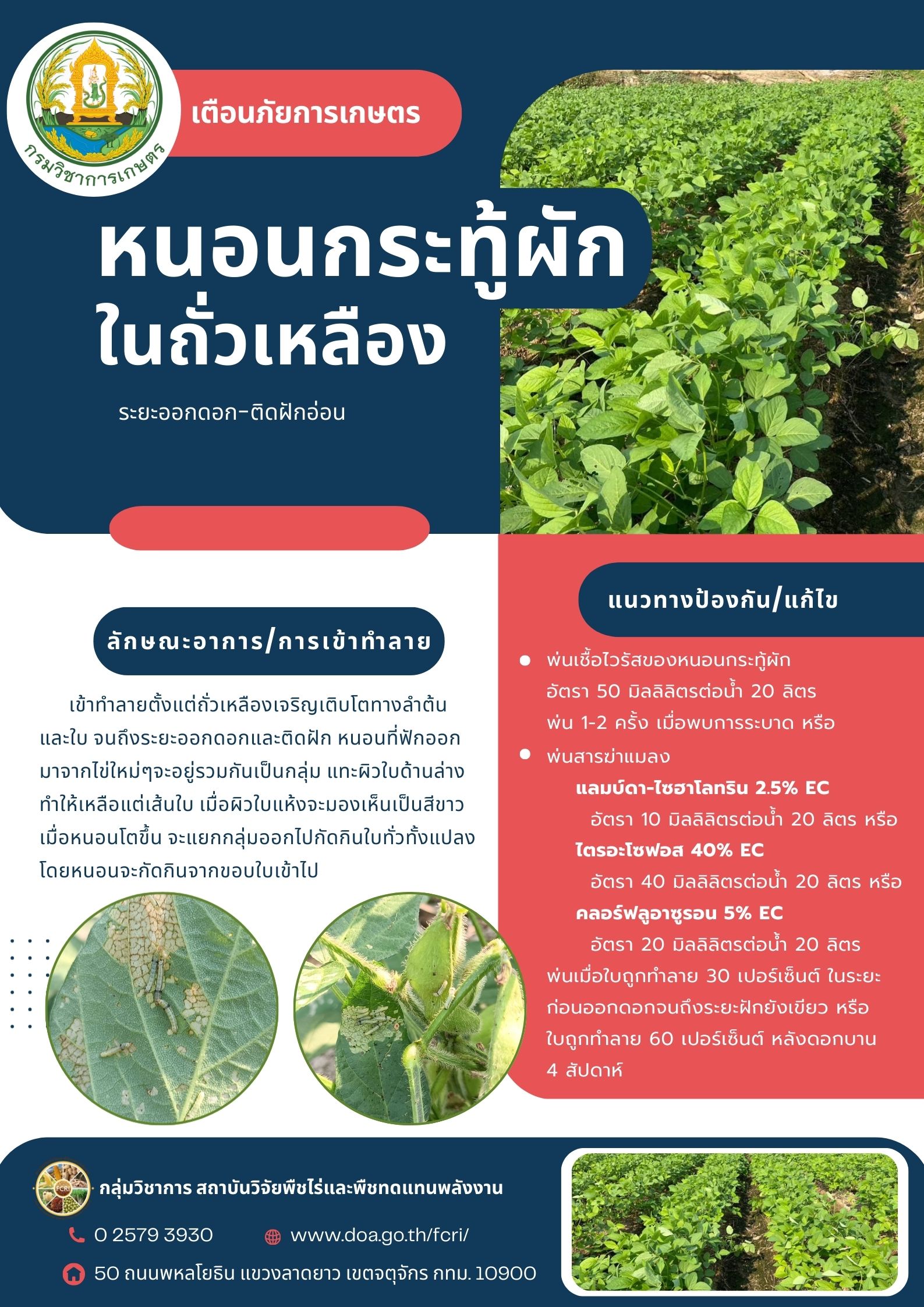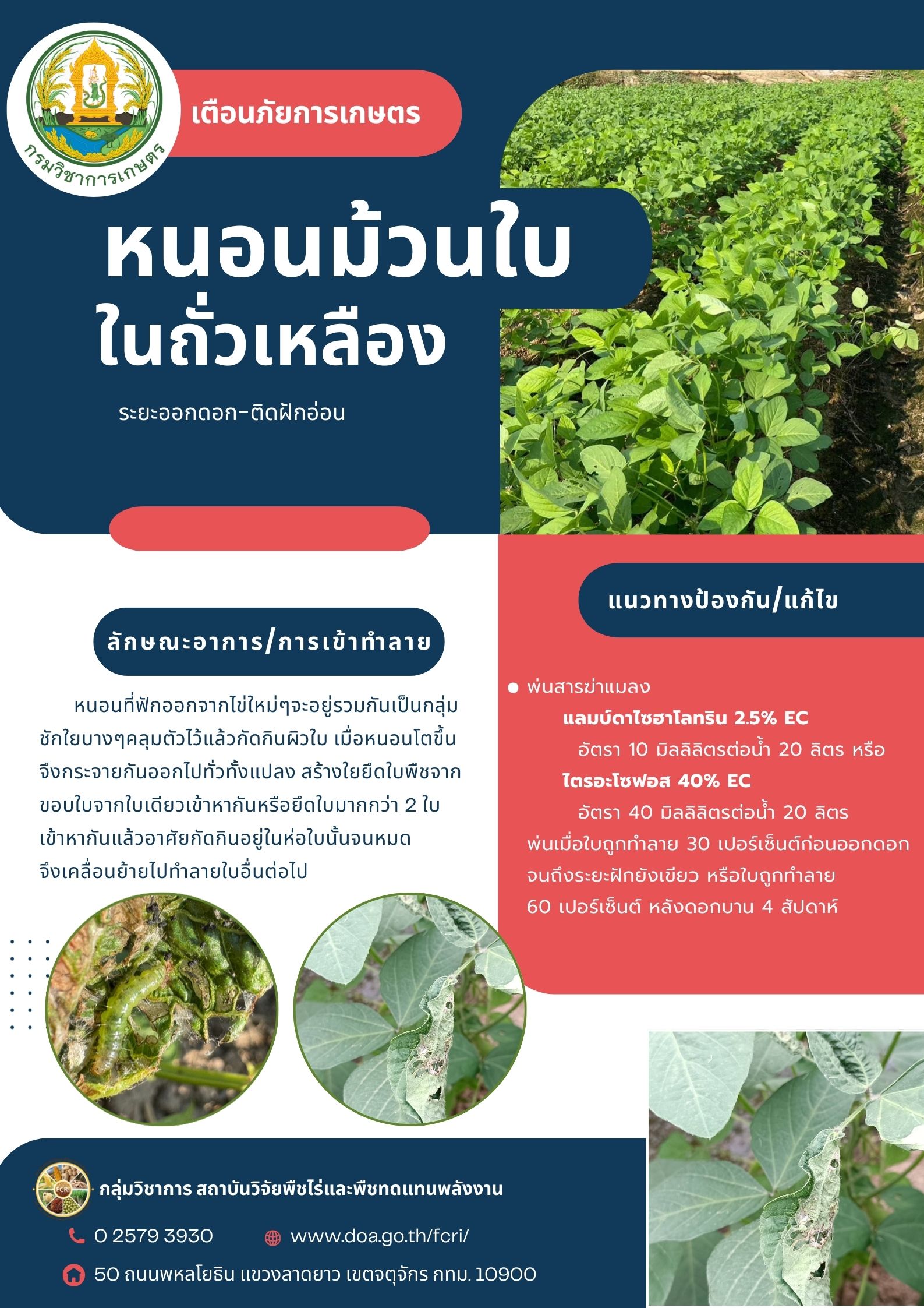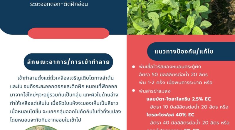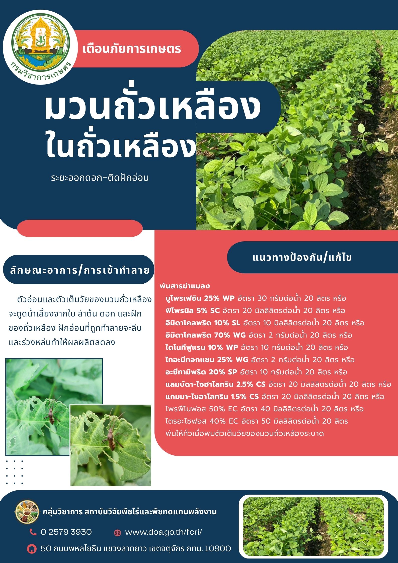 เตือนภัยพืช เตือนภัยการเกษตร เกษตรกรผู้ปลูกถั่วเหลืองในระยะออกดอก-ติดฝักอ่อน ให้ระวังการเข้าทำลายของแมลงศัตรูพืช ได้แก่ 1.หนอนกระทู้ผัก 2.หนอนม้วนใบ 3.มวนถั่วเหลือง 4.หนอนเจาะฝักถั่ว ให้หมั่นสำรวจแปลงปลูกหากพบแมลงศัตรูเริ่มเข้าทำลายให้รีบทำการป้องกันกำจัดตามคำแนะนำเพื่อไม่ให้มีการระบาดและส่งผลกระทบต่อผลผลิต 22/09/2025 admin