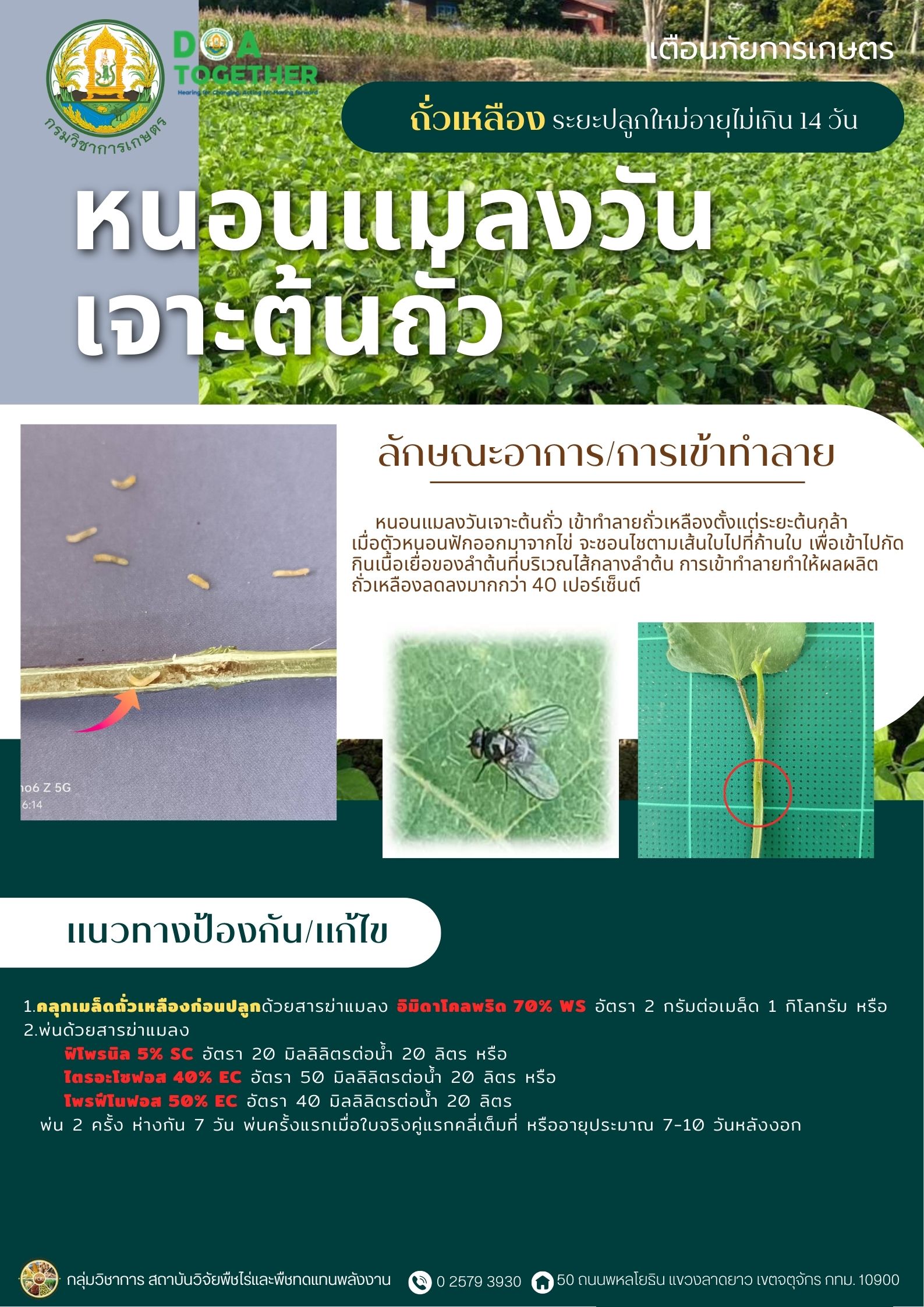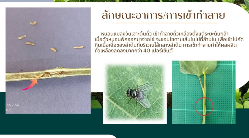 เตือนภัยพืช เตือนภัยการเกษตร เกษตรกรผู้ปลูกถั่วเหลืองในระยะปลูกใหม่อายุไม่เกิน 14 วัน ให้ระวังการเกิดโรครากเน่าและลำต้นเน่า สาเหตุจากเชื้อรา Sclerotium rolfsii และ แมลงศัตรูพืช ได้แก่ หนอนแมลงวันเจาะต้นถั่ว เกษตรกรควรหมั่นสำรวจแปลงปลูกอย่างสม่ำเสมอ หากเริ่มพบการเข้าทำลายของศัตรูพืช ให้รีบทำการป้องกันกำจัดตามคำแนะนำ เพื่อไม่ให้ส่งผลกระทบต่อการเจริญเติบโตของถั่วเหลือง 26/12/2025 admin