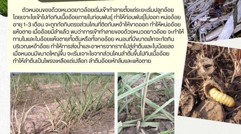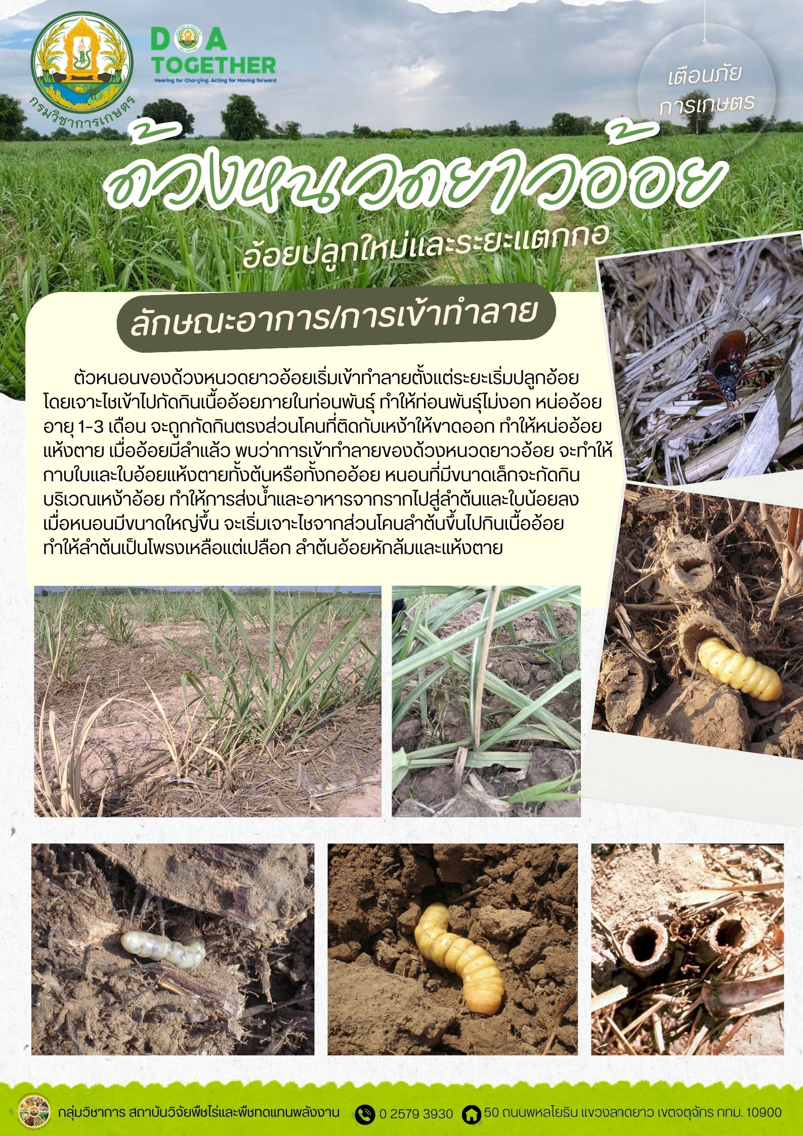 เตือนภัยพืช เตือนภัยการเกษตร เกษตรกรผู้ปลูกอ้อย ในอ้อยปลูกใหม่และระยะแตกกอ ให้ระวังการเข้าทำลายของด้วงหนวดยาวอ้อย ควรหมั่นสำรวจแปลงปลูกอย่างสม่ำเสมอ หากเริ่มพบอาการหรือการเข้าทำลาย ให้รีบทำการป้องกันกำจัดตามคำแนะนำ เพื่อไม่ให้มีการระบาดและส่งผลกระทบต่อการเจริญเติบโตของอ้อย 21/01/2026 admin