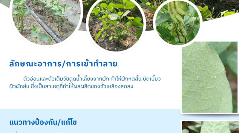 เตือนภัยพืช เตือนภัยการเกษตร เกษตรกรผู้ปลูกถั่วเหลืองในระยะการเจริญเติบโตทางด้านลำต้น ให้ระวังการเข้าทำลายของแมลงศัตรูพืช ได้แก่หนอนกระทู้ผัก หนอนม้วนใบ เพลี้ยอ่อน และแมลงหวี่ขาวยาสูบ ควรหมั่นสำรวจแปลงปลูกอย่างสม่ำเสมอ หากเริ่มพบแมลงศัตรูพืช ลักษณะอาการหรือการเข้าทำลาย ให้รีบทำการป้องกันกำจัดตามคำแนะนำ เพื่อไม่ให้มีการระบาดและส่งผลกระทบต่อการเจริญเติบโตของต้นถั่วเหลือง 21/01/2026 admin