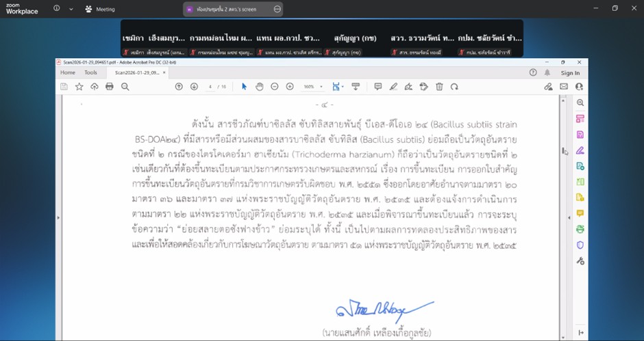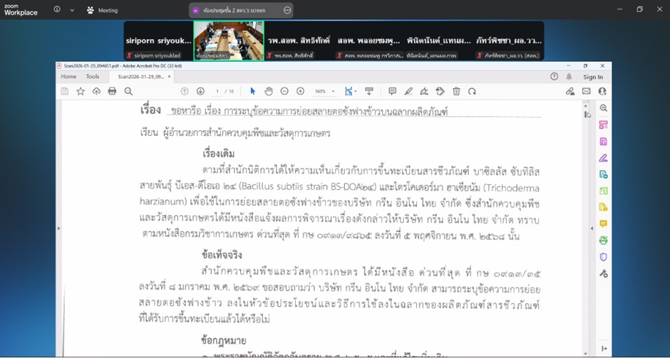 นายธรรมรัตน์ ทองมี ผู้อำนวยการสถาบันวิจัยพืชไร่และพืชทดแทนพลังงาน พร้อมด้วย นางสาวสุรีรัตน์ ทองคำ นักกีฏวิทยาปฏิบัติการ เข้าร่วมประชุมคณะทำงานเพื่อพิจารณาการขึ้นทะเบียนวัตถุอันตรายทางการเกษตร ครั้งที่ 49-1/2569 เพื่อร่วมพิจารณาและให้ข้อคิดเห็นประกอบการขึ้นทะเบียนวัตถุอันตรายทางการเกษตร โดยมีผู้อำนวยการสำนักควบคุมพืชและวัสดุการเกษตร เป็นประธานการประชุม ณ ห้องประชุมชั้น 2 สำนักควบคุมพืชและวัสดุการเกษตร และประชุมผ่านระบบออนไลน์