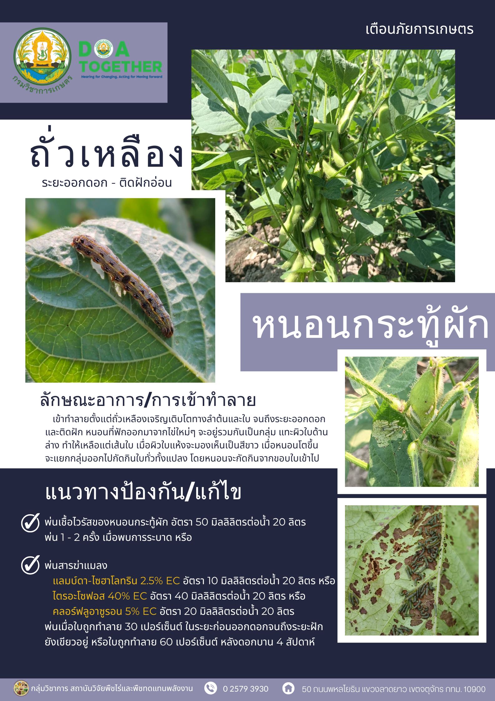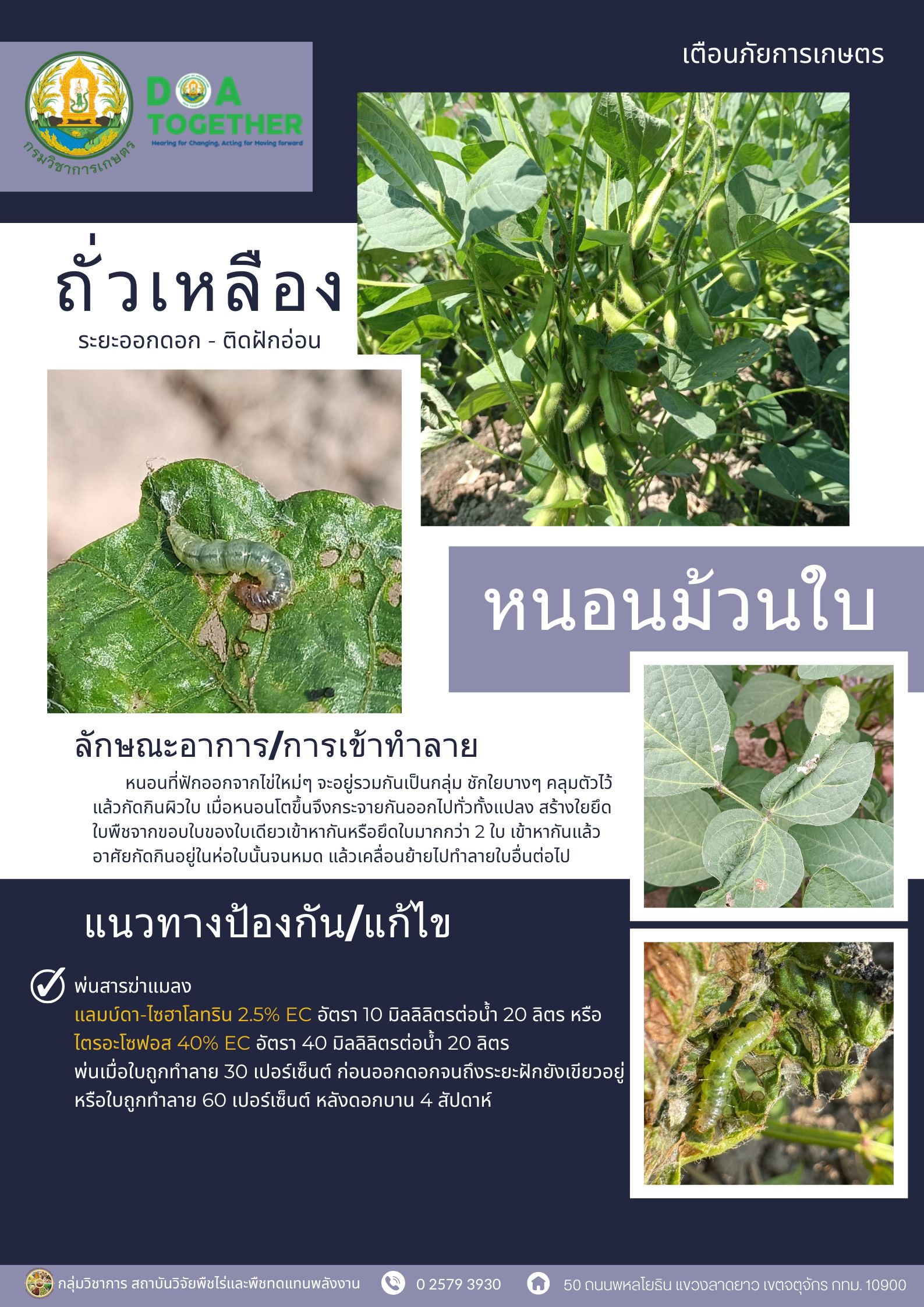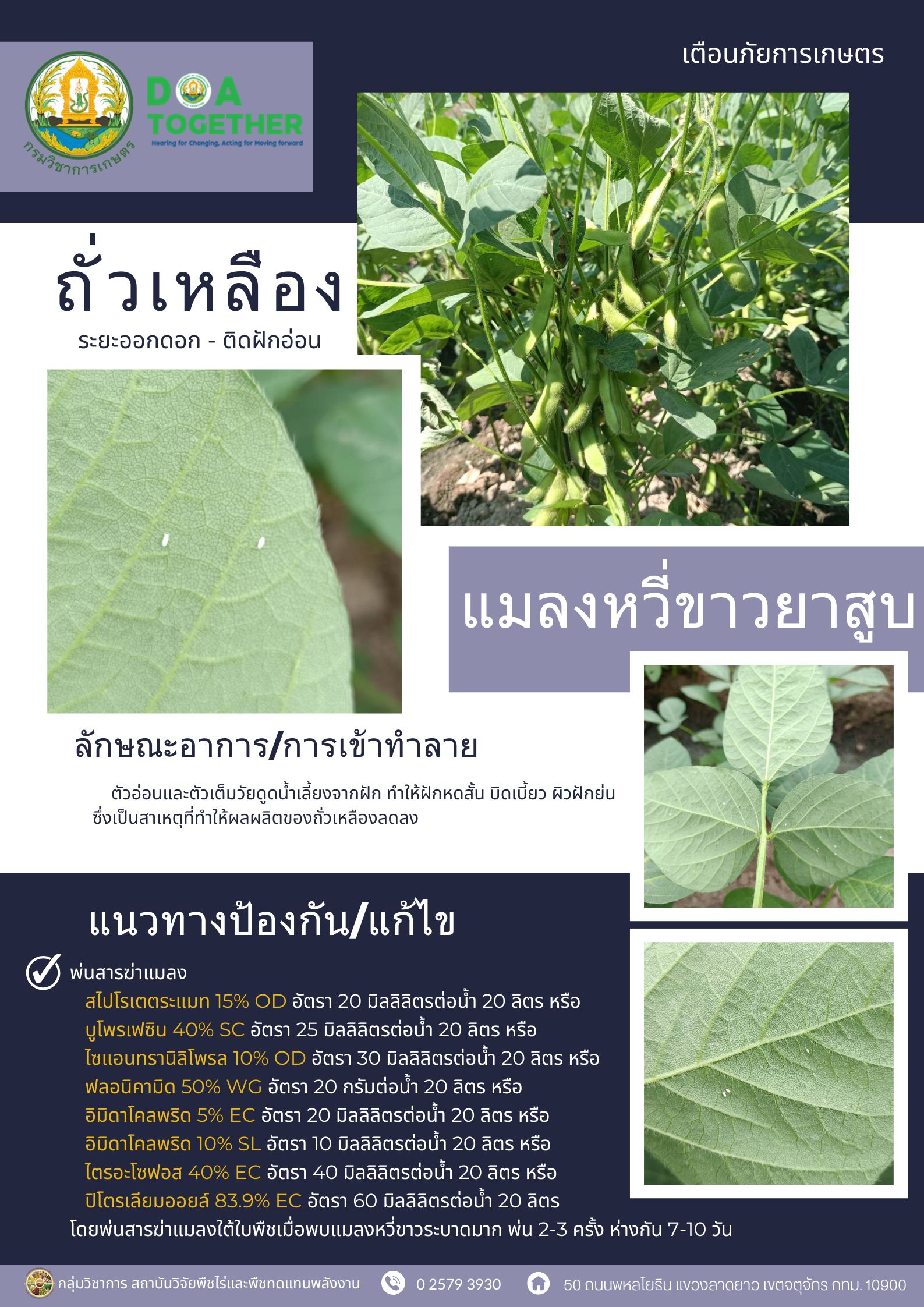 เตือนภัยพืช เตือนภัยการเกษตร เกษตรกรผู้ปลูกถั่วเหลืองในระยะออกดอก-ติดฝักอ่อน ให้ระวังการเข้าทำลายของแมลงศัตรูพืช ได้แก่ หนอนกระทู้ผัก หนอนม้วนใบ แมลงหวี่ขาวยาสูบ มวนถั่วเหลือง และหนอนเจาะฝักถั่ว ให้หมั่นสำรวจแปลงปลูกอย่างสม่ำเสมอ หากเริ่มพบแมลงศัตรูหรือลักษณะอาการ การเข้าทำลาย ให้รีบทำการป้องกันกำจัดตามคำแนะนำ เพื่อไม่ให้ส่งผลกระทบต่อผลผลิตถั่วเหลือง 04/03/2026 admin
