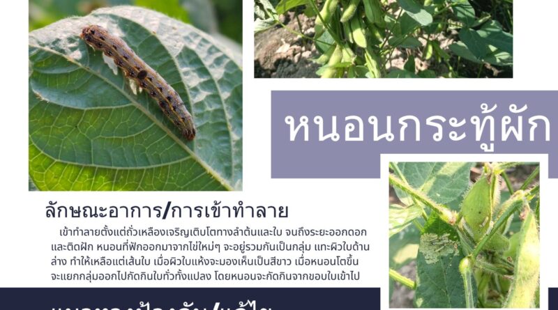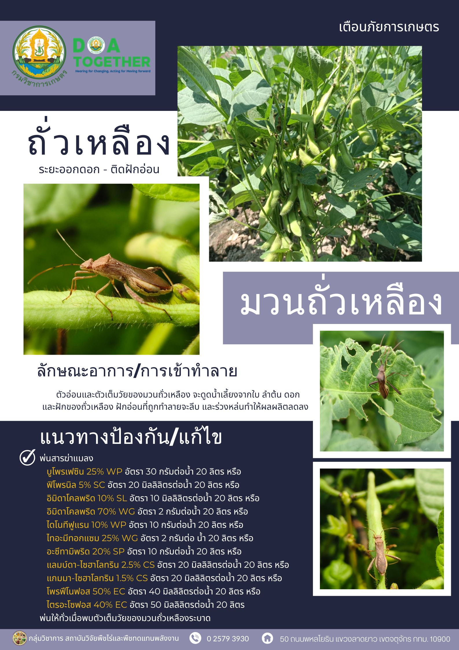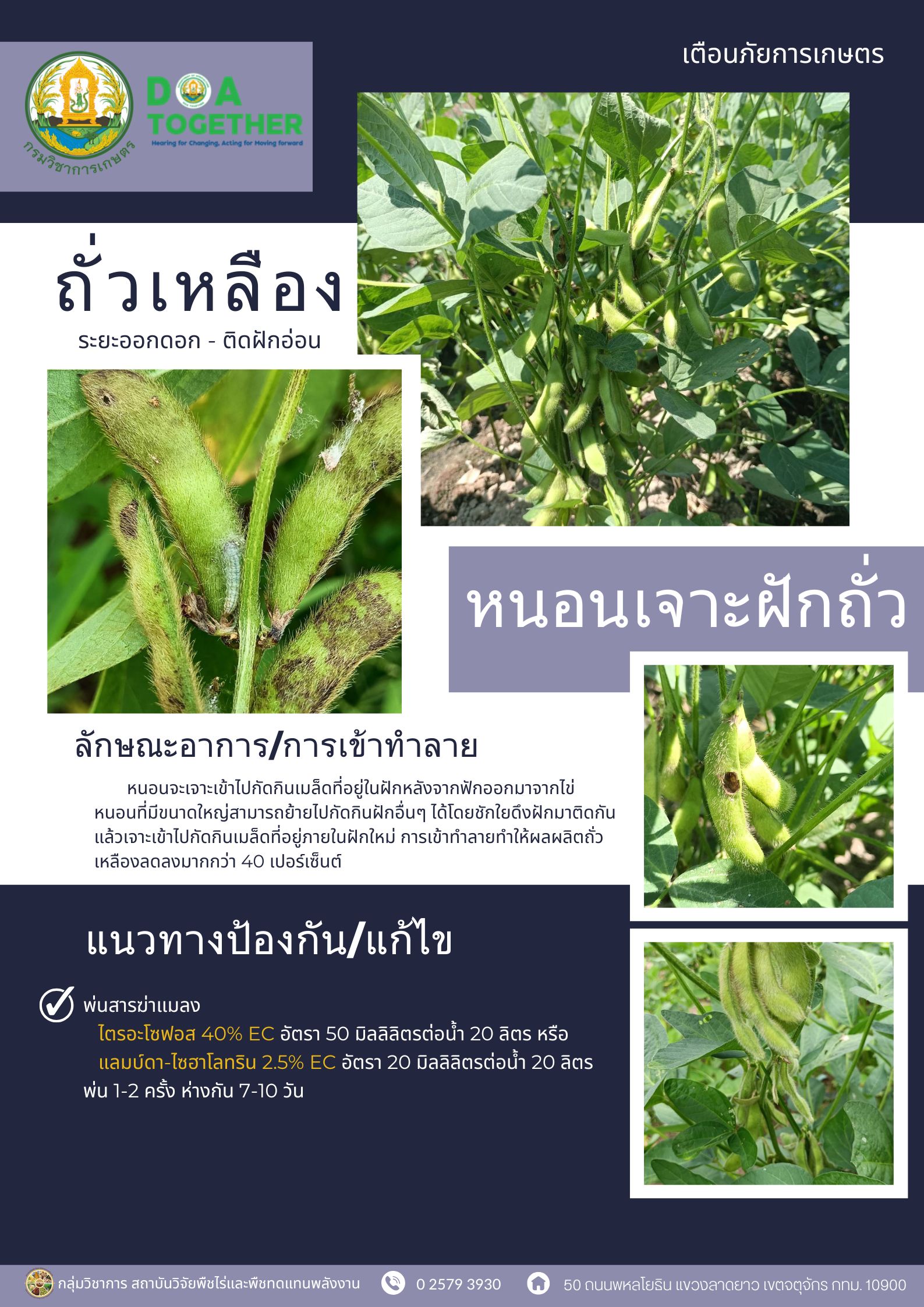เตือนภัยพืช เตือนภัยการเกษตร เกษตรกรผู้ปลูกถั่วเหลืองในระยะออกดอก-ติดฝักอ่อน ให้ระวังการเข้าทำลายของแมลงศัตรูพืช ได้แก่ หนอนกระทู้ผัก หนอนม้วนใบ แมลงหวี่ขาวยาสูบ มวนถั่วเหลือง และหนอนเจาะฝักถั่ว ให้หมั่นสำรวจแปลงปลูกอย่างสม่ำเสมอ หากเริ่มพบแมลงศัตรูหรือลักษณะอาการ การเข้าทำลาย ให้รีบทำการป้องกันกำจัดตามคำแนะนำ เพื่อไม่ให้ส่งผลกระทบต่อผลผลิตถั่วเหลือง 04/03/2026 admin