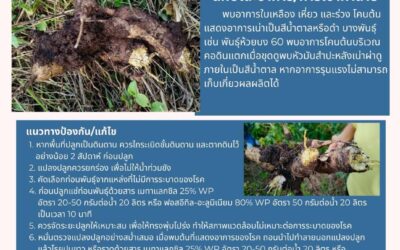 เตือนภัยพืช 16/10/2025 admin เตือนภัยการเกษตร เกษตรกรผู้ปลูกมันสำปะหลัง เนื่องจากในช่วงนี้มีฝนตกหนักถึงหนักมากในบางพื้นที่ ให้ระวังการเกิดโรคโคนเน่า หัวเน่า ที่เกิดจากเชื้อรา Phytophthora melonis ในมันสำปะหลังระยะปลูกใหม่-สร้างหัว/สะสมแป้ง ควรหมั่นสำรวจแปลงปลูกหากเริ่มพบลักษณะอาการของโรคให้รีบทำการป้องกันและแก้ไขตามคำแนะนำ เพื่อไม่ให้ส่งผลกระทบต่อผลผลิตมันสำปะหลัง Read More