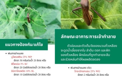 เตือนภัยพืช 29/10/2025 admin เตือนภัยการเกษตร เกษตรกรผู้ปลูกถั่วเหลืองในระยะฝักเต็ม-ฝักแก่ ให้ระวังการเข้าทำลายของหนอนเจาะฝักและมวนถั่วเหลือง หากเริ่มพบแมลงศัตรูพืช ให้รีบทำการป้องกันกำจัดตามคำแนะนำเพื่อไม่ให้ระบาดและส่งผลกระทบต่อผลผลิตถั่วเหลือง Read More