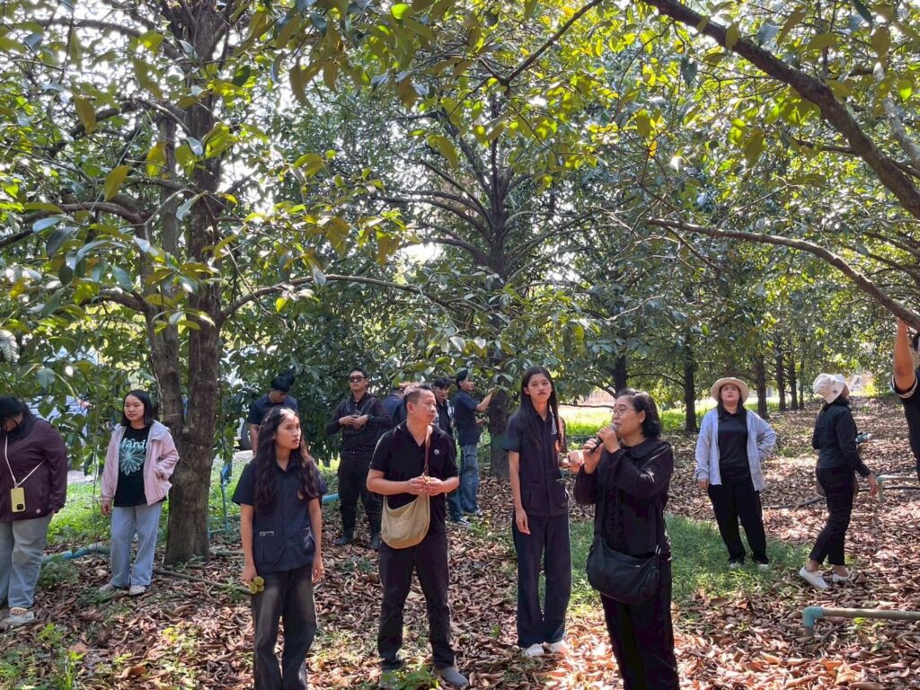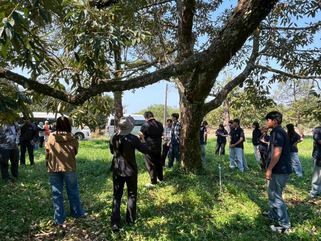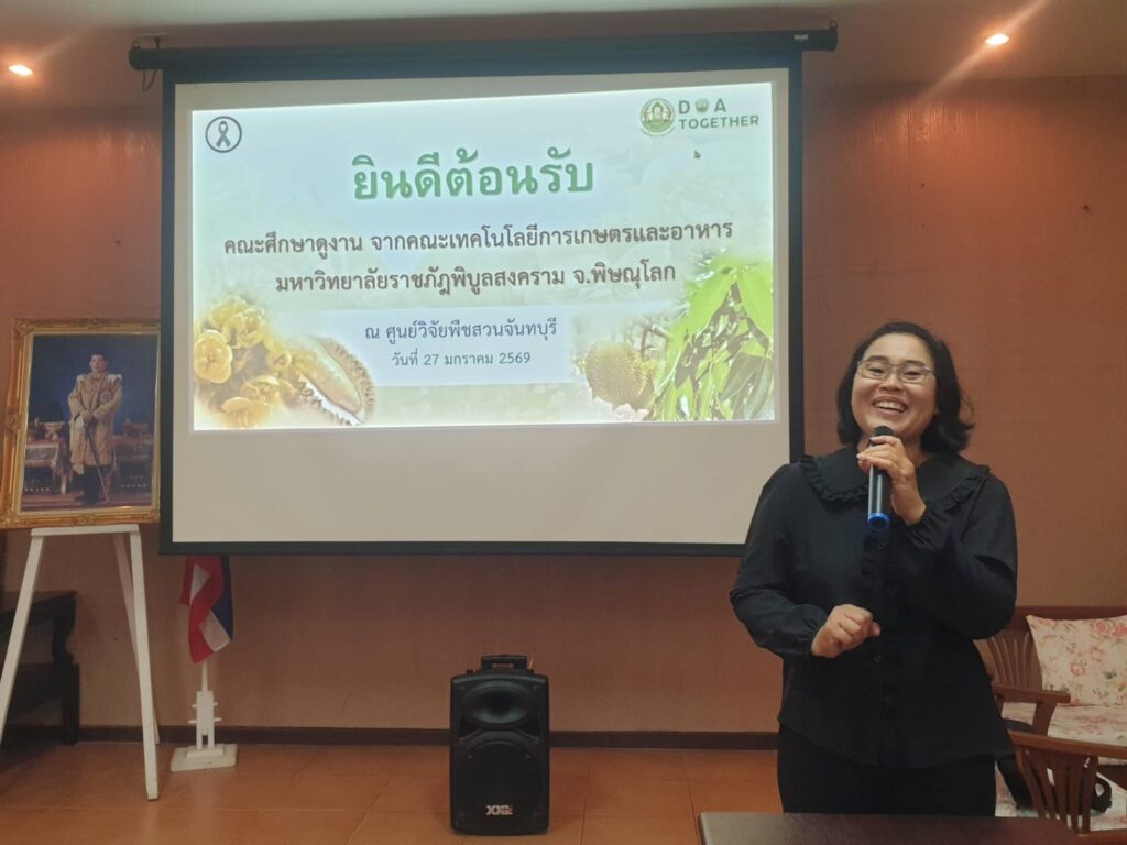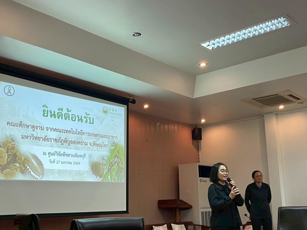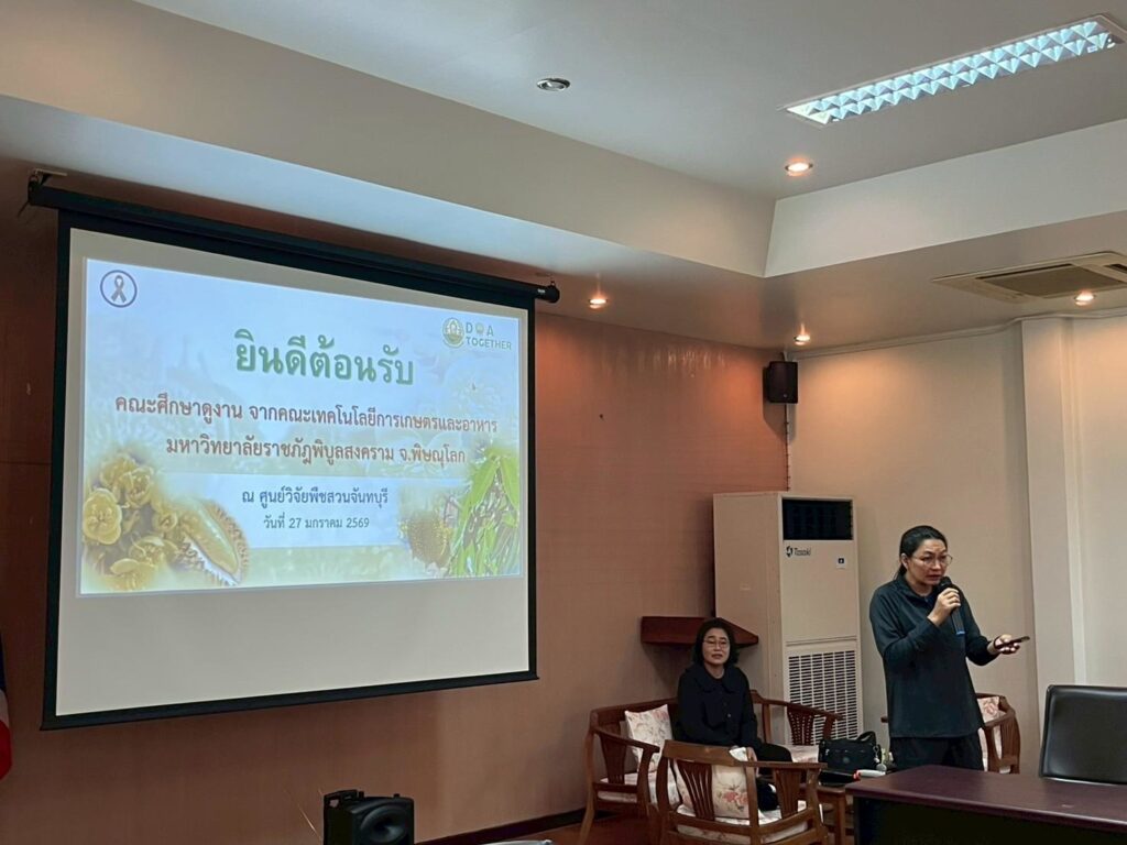 วันที่ 27 มกราคม 2569 นายสำเริง ช่างประเสริฐ ผู้อำนวยการศูนย์วิจัยพืชสวนจันทบุรี มอบหมายให้นางสาวอรวินทินี ชูศรี นักวิชาการเกษตรชำนาญการ เป็นวิทยากรบรรยาย เรื่อง เทคโนโลยีการผลิตทุเรียนคุณภาพ และการปรับปรุงพันธุ์ทุเรียน และดร.ปิยะมาศ โสมภีร์ นักวิชาการเกษตรชำนาญการ เป็นวิทยากรบรรยาย เรื่อง เทคโนโลยีการผลิตมังคุดคุณภาพ พร้อมด้วยนายนทีพงษ์ เมืองแก้ว นักวิชาการเกษตรปฏิบัติการ นางนาทระพี สุขจิตไพบูลย์ผล นักวิชาการเกษตร นางสาวจุฬารัตน์ อ่อนโส นักวิชาการเกษตร นางสาวกรกรนก พิกุลหอม นักวิชาการเกษตร และนายณัฐชัย สัทธยาสัย นักวิชาการเกษตร ให้การต้อนรับนักศึกษาและอาจารณ์จากคณะเทคโนโลยีการเกษตรและอาหาร มหาวิทยาลัยราชภัฏพิบูลสงคราม จำนวน 50 คน ณ อาคารฝึกอบรม และนำชมแปลงรวบรวมพันธุ์ทุเรียน มังคุด ภายในโครงการท่องเที่ยวศูนย์วิจัยพืชสวนจันทบุรี ตำบลตะปอน อำเภอขลุง จังหวัดจันทบุรี