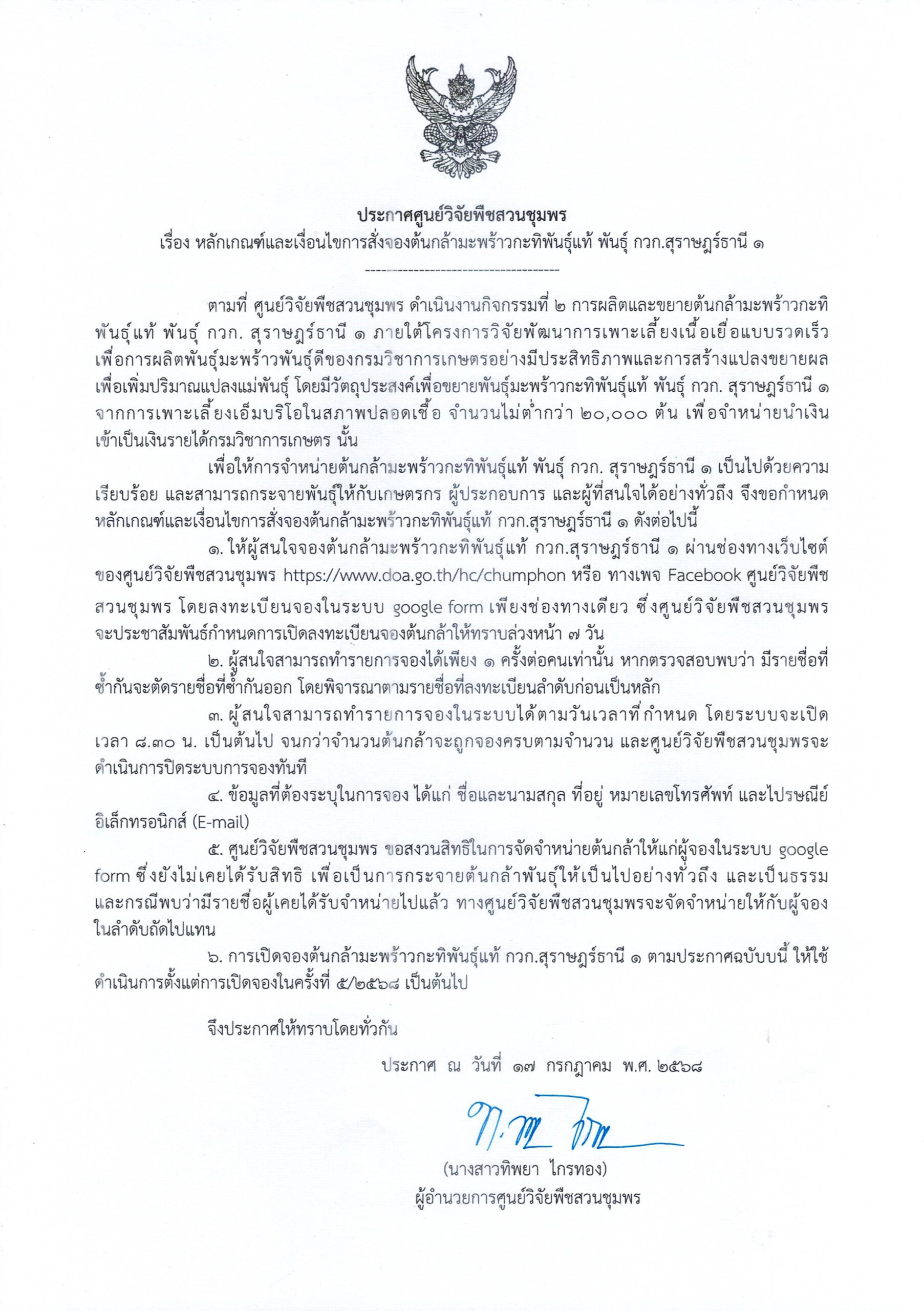 ประกาศศูนย์วิจัยพืชสวนชุมพร เรื่อง