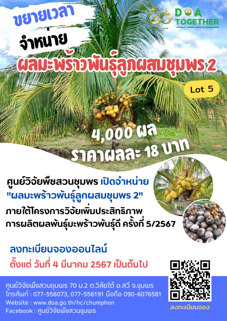 ด้วยศูนย์วิจัยพืชสวนชุมพร มีความประสงค์ จำหน่ายผลมะพร้าวพันธุ์ลูกผสมชุมพร 2 เพื่อสร้างเป็นแปลงเพาะชำสำหรับผลิตต้นกล้าภายใต้การควบคุมมาตรฐานกรมวิชาการเกษตรว่าด้วยการควบคุมคุณภาพผลพันธุ์มะพร้าว สำหรับจำหน่ายเป็นต้นกล้าคุณภาพ “ภายใต้โครงการวิจัยเพิ่มประสิทธิภาพ การผลิตผลพันธุ์มะพร้าวพันธุ์ดี” ครั้งที่ 5/2567 จำนวน 4,000 ผล ราคาผลละ 18 บาท โดยจะเปิดจำหน่ายในวันที่ 4 มีนาคม พ.ศ.