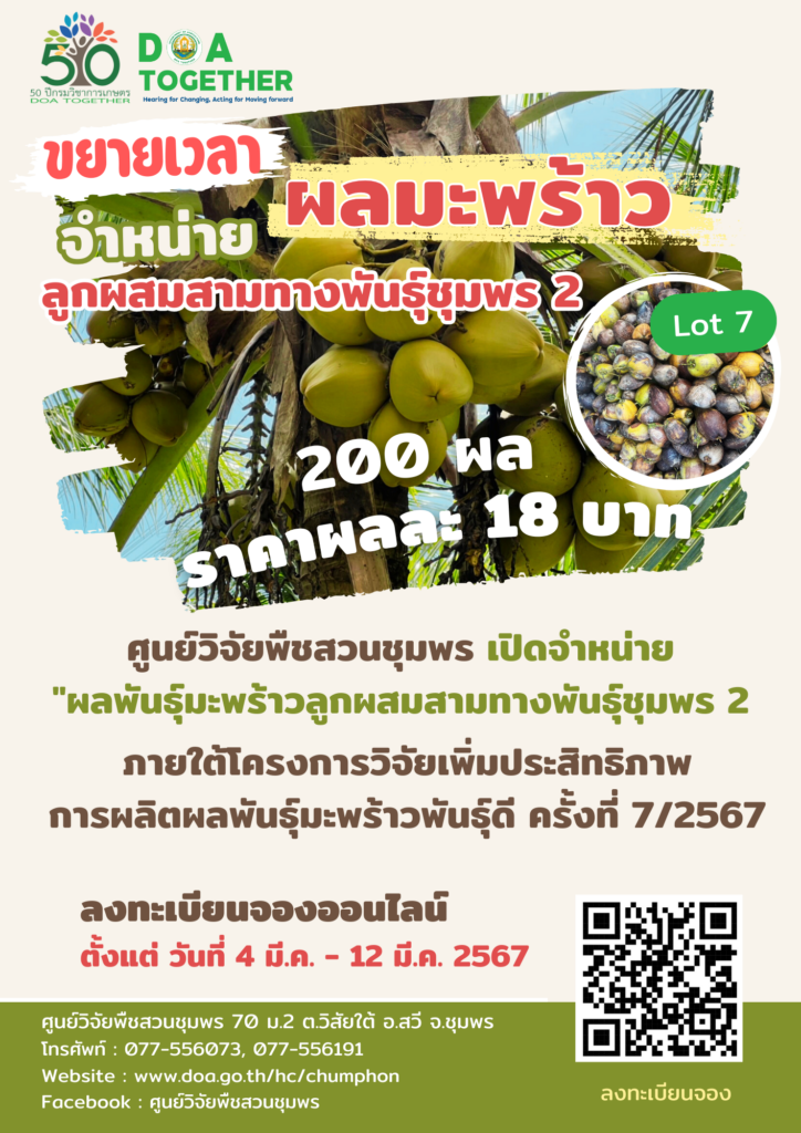 ด้วยศูนย์วิจัยพืชสวนชุมพร มีความประสงค์ จำหน่ายผลมะพร้าวลูกผสมสามทางชุมพร 2 เพื่อสร้างเป็นแปลงเพาะชำสำหรับผลิตต้นกล้าภายใต้การควบคุมมาตรฐานกรมวิชาการเกษตรว่าด้วยการควบคุมคุณภาพผลพันธุ์มะพร้าว สำหรับจำหน่ายเป็นต้นกล้าคุณภาพ “ภายใต้โครงการวิจัยเพิ่มประสิทธิภาพ การผลิตผลพันธุ์มะพร้าวพันธุ์ดี” ครั้งที่ 7/2567 จำนวน 200 ผล ราคาผลละ 18 บาท โดยจะขยายเวลาเปิดจำหน่ายในวันที่ 4-12 มีนาคม พ.ศ.
